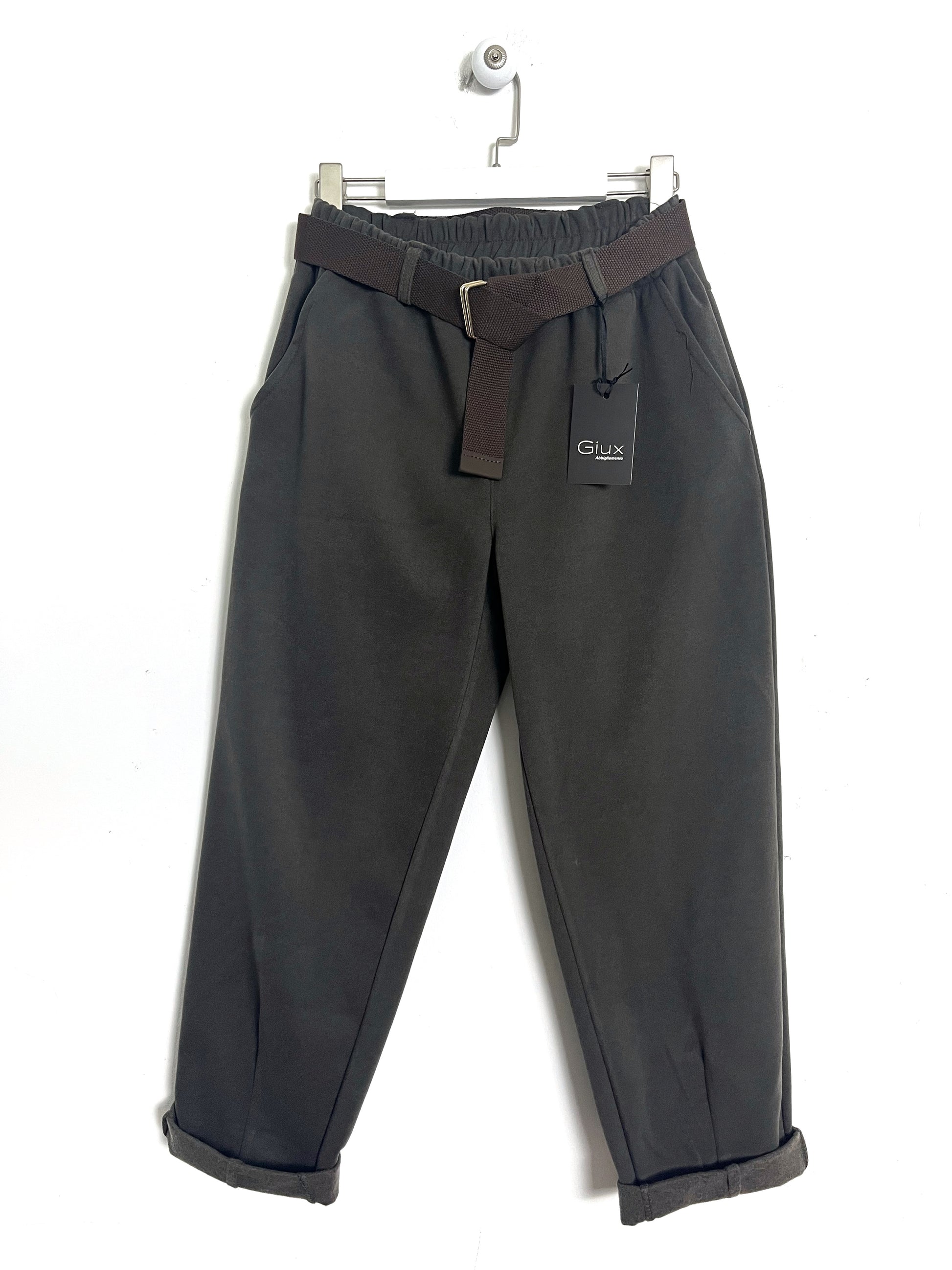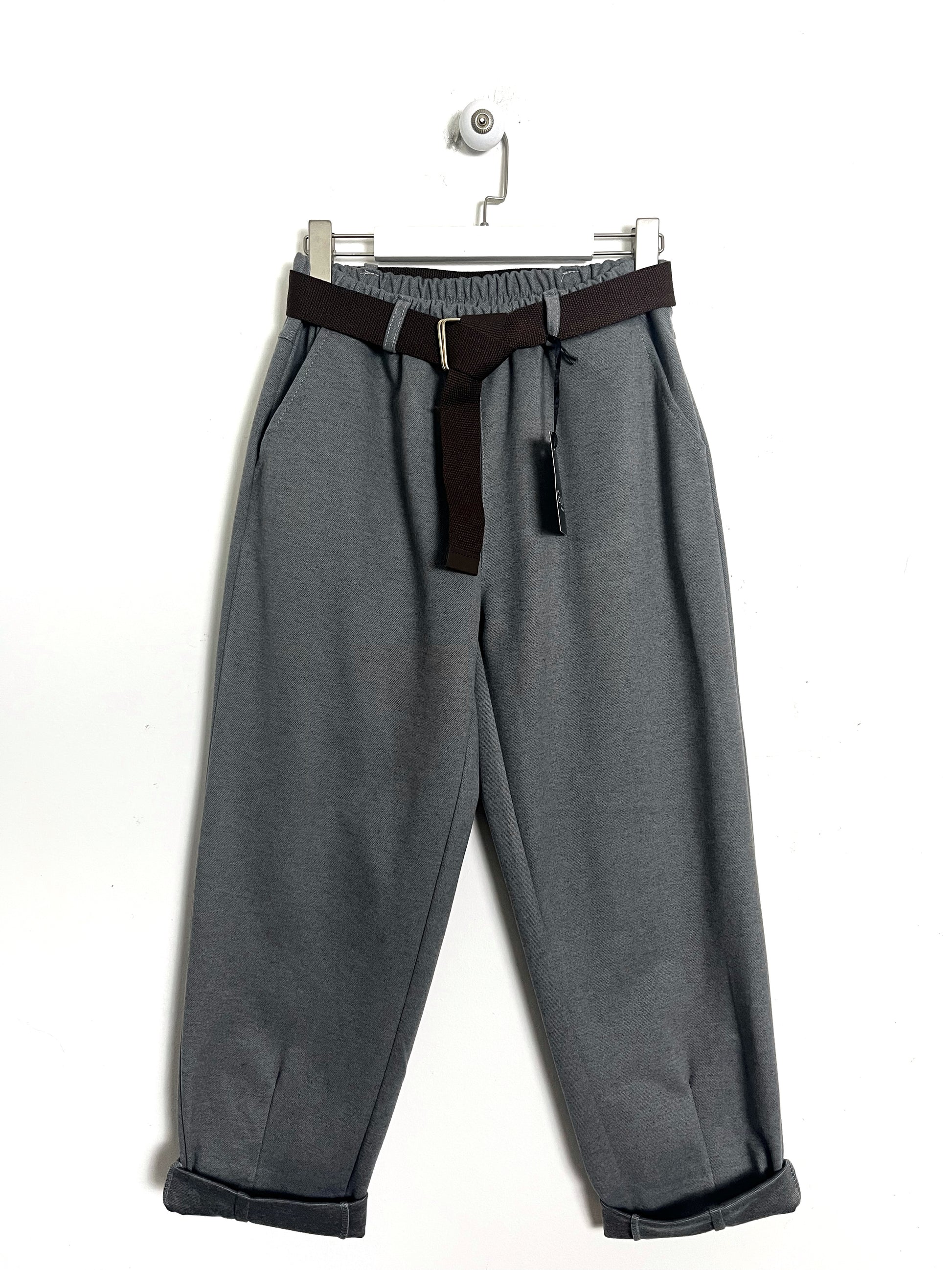 Pantalone in caldissimo panno elasticizzato. Vita alta con elastico in vita, passanti con cintura. 2 tasche davanti oblique. 2 tasche applicate dietro