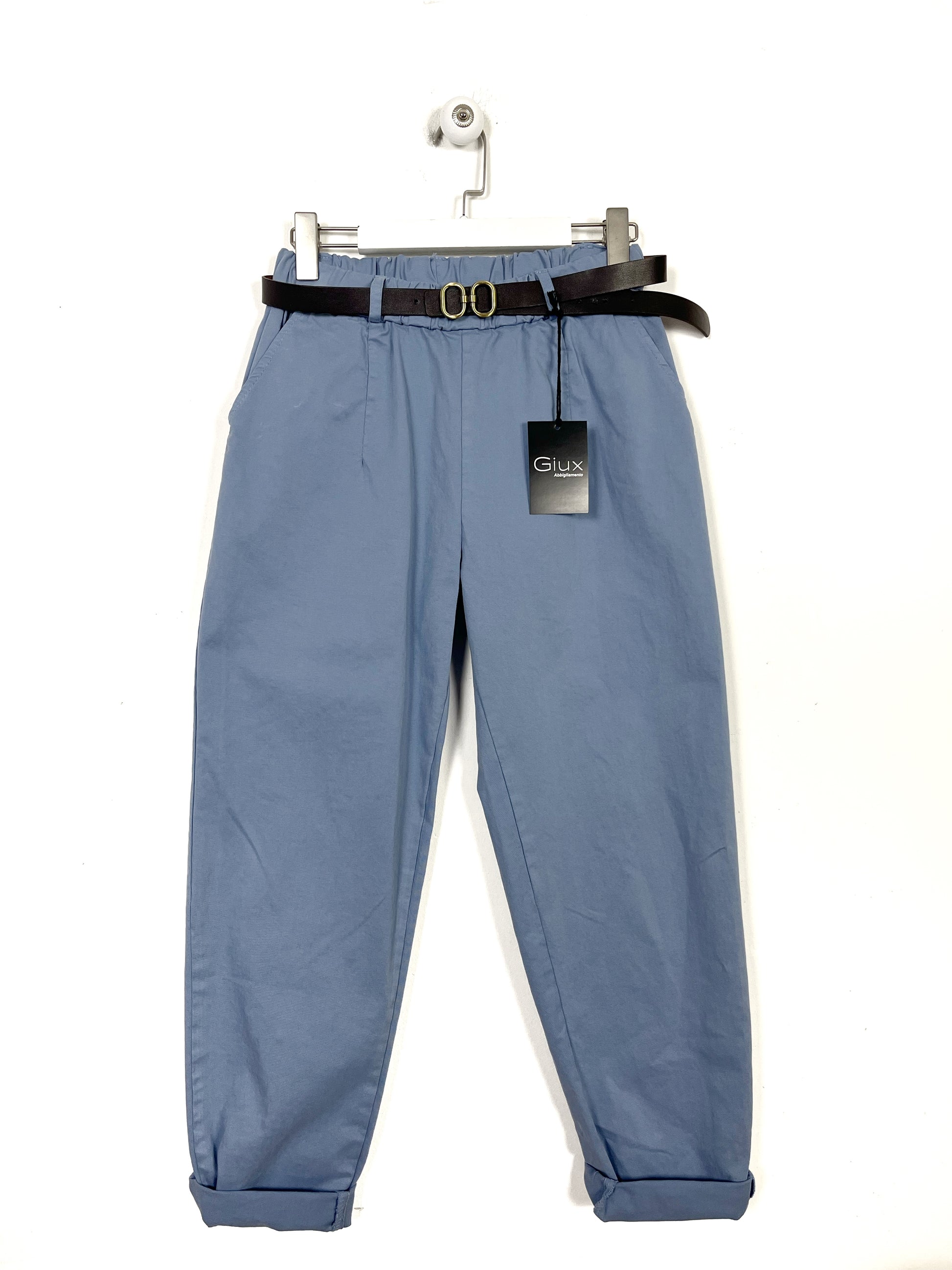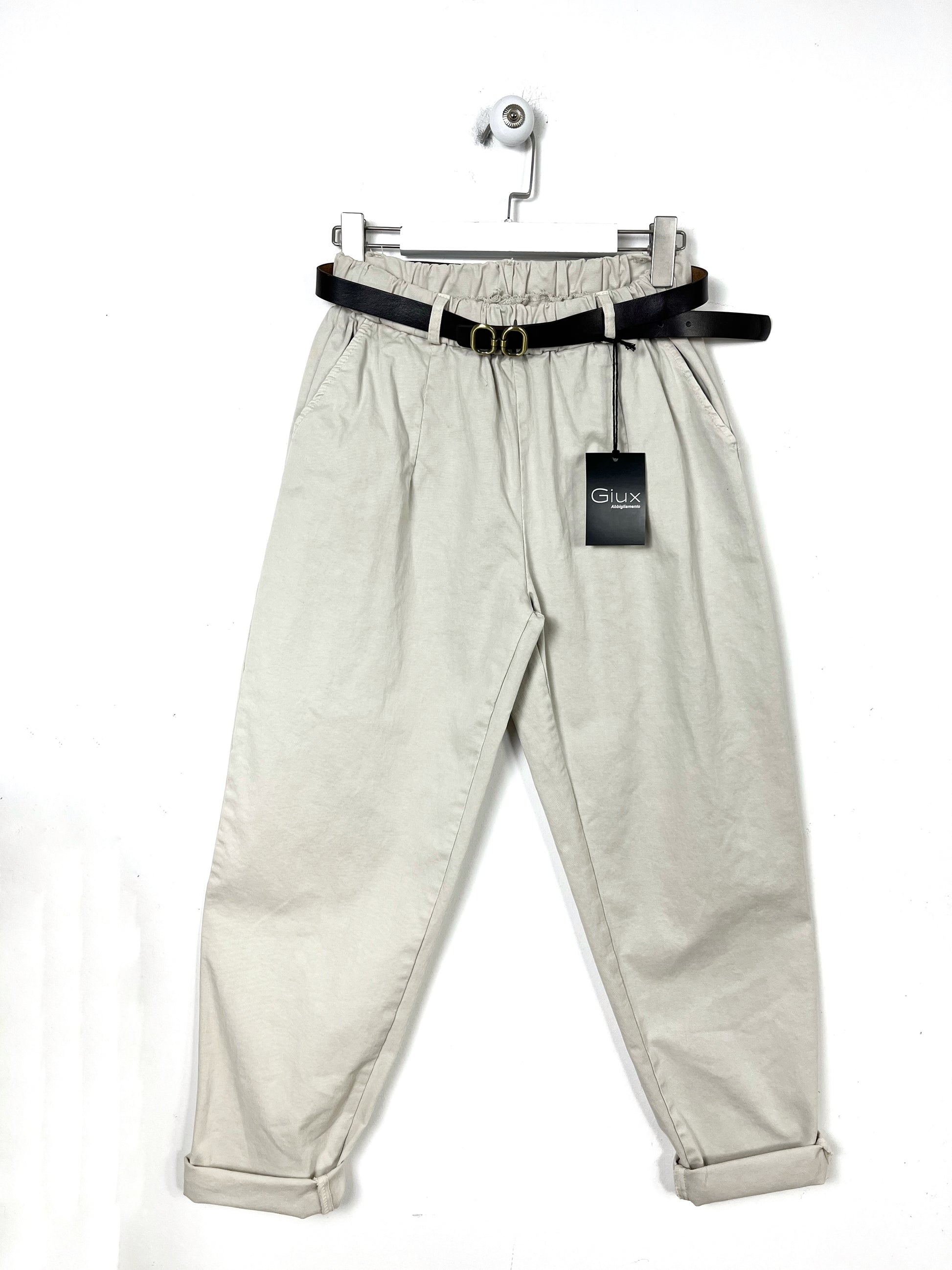 Pantalone in cotone leggermente elasticizzato . Vita alta con elastico in vita, passanti con cinturi a in ecopelle. 2 tasche davanti oblique. Taschine finte dietro