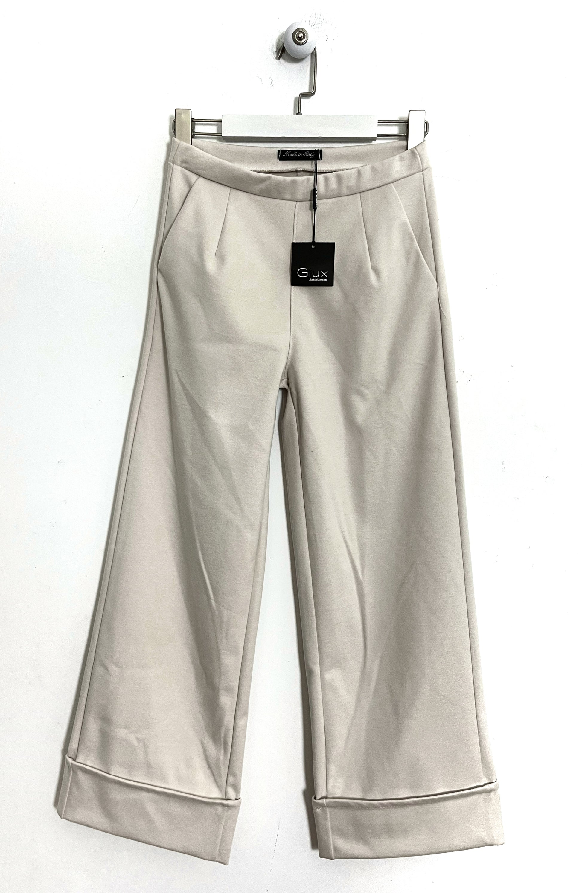 Pantalone vita alta con elastico in vita. Tasche laterali. Gamba larga con finto risvolto.
