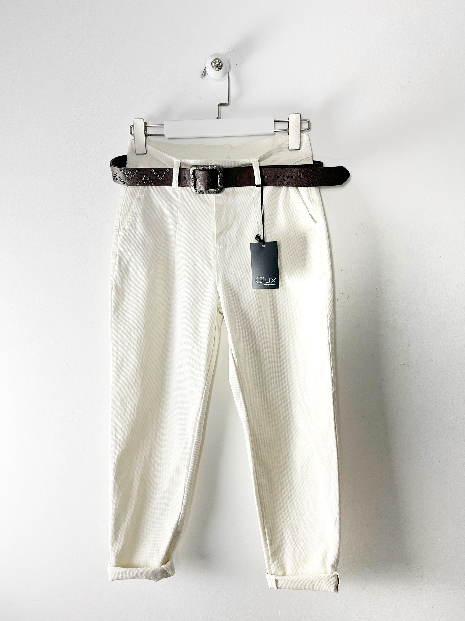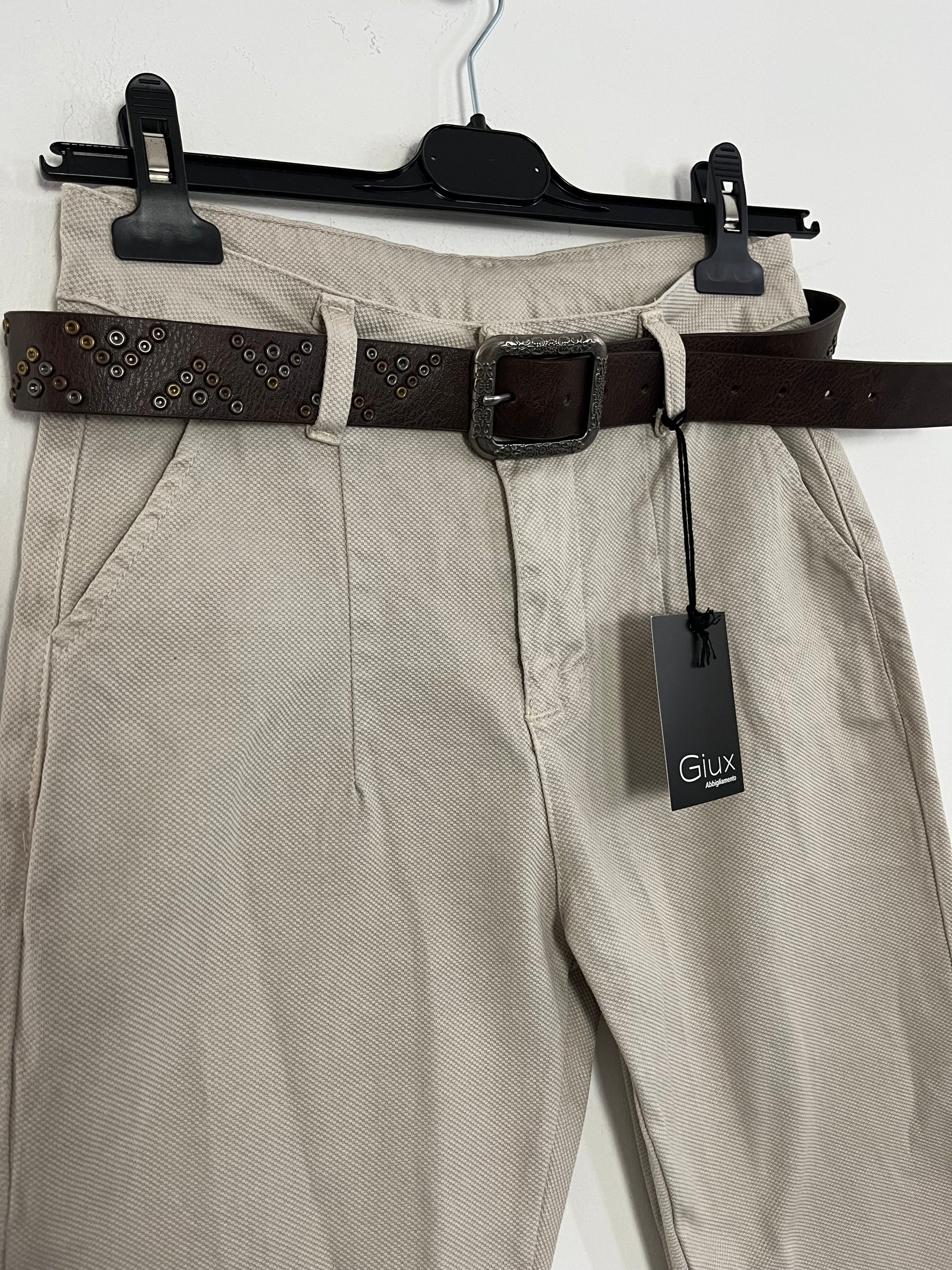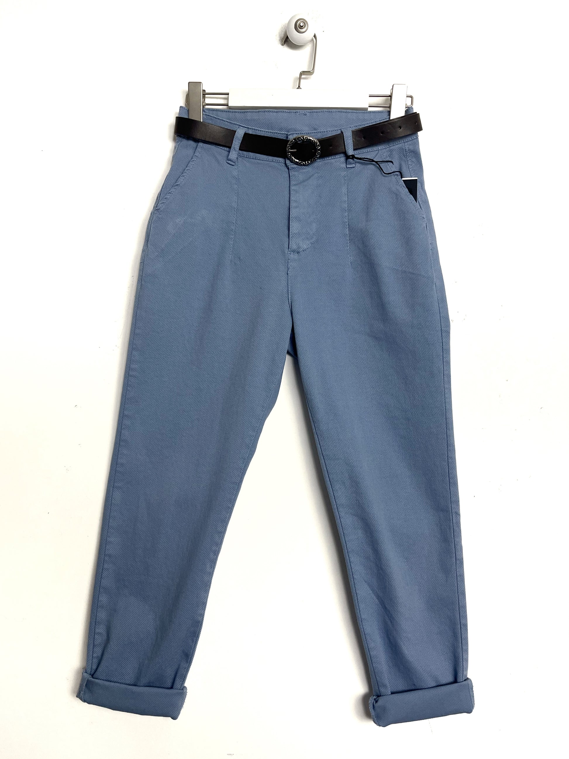 Pantalone in pique di cotone, tasche oblique e pence sul davanti. Vita alta, vestibilità morbida. Chiusura con bottone e cerniera. Due taschine finte sul retro. Cintura in dotazione.