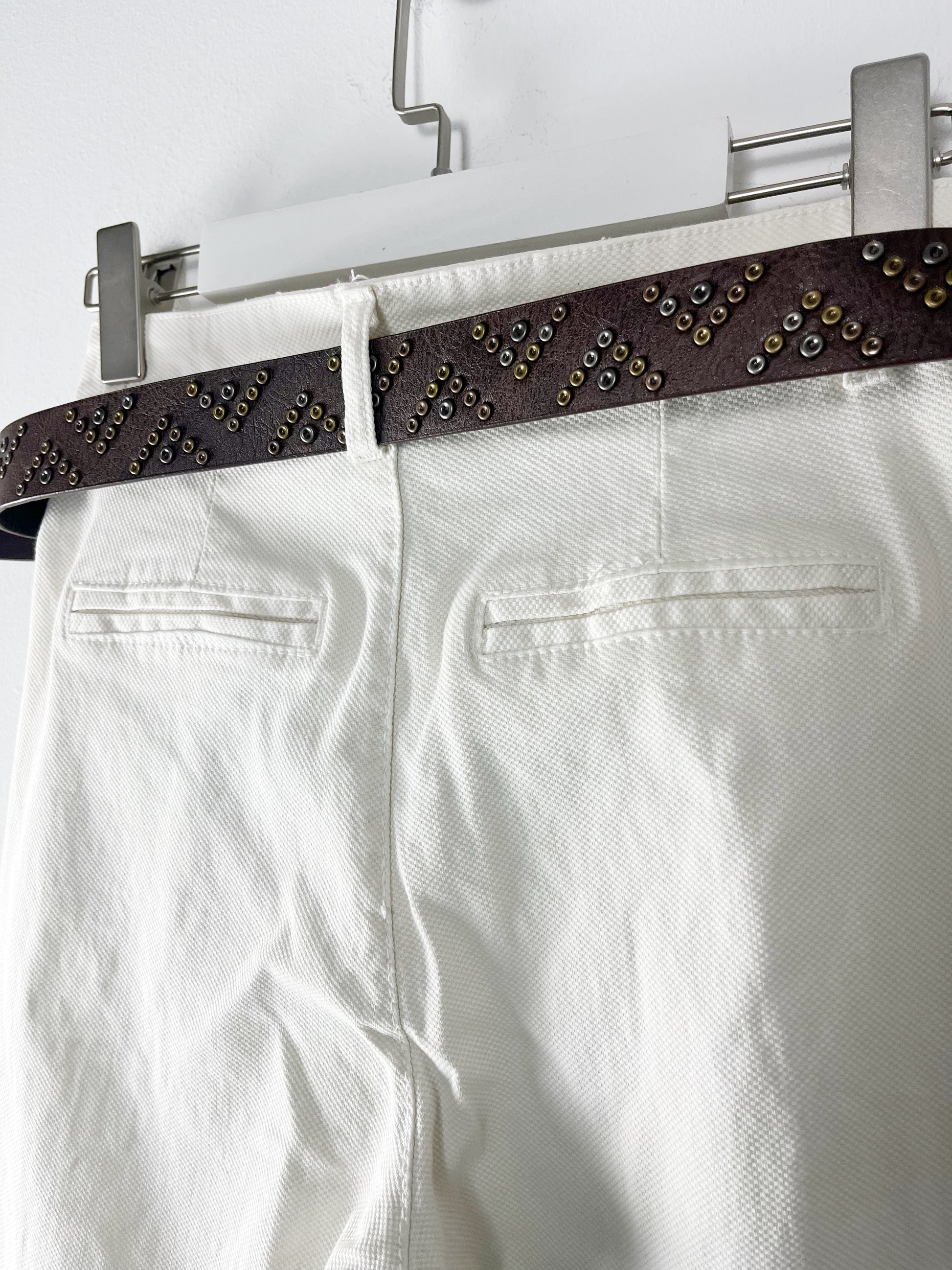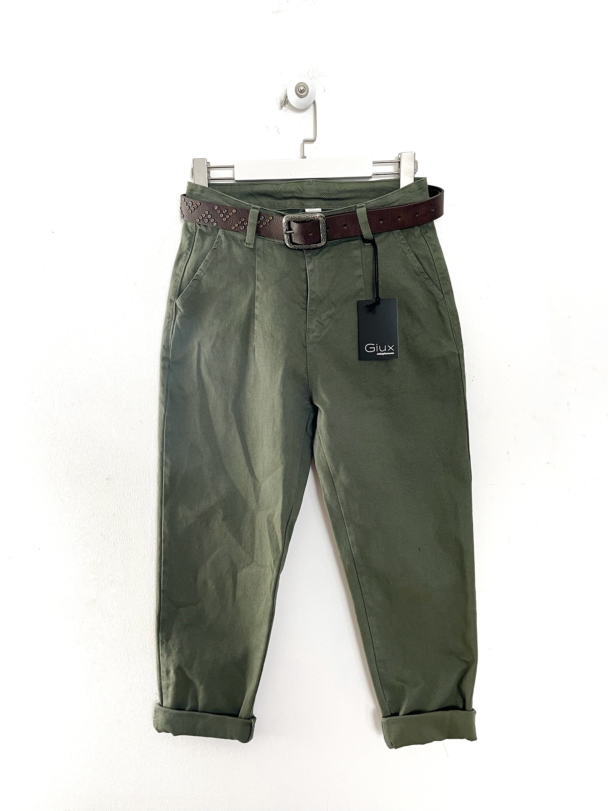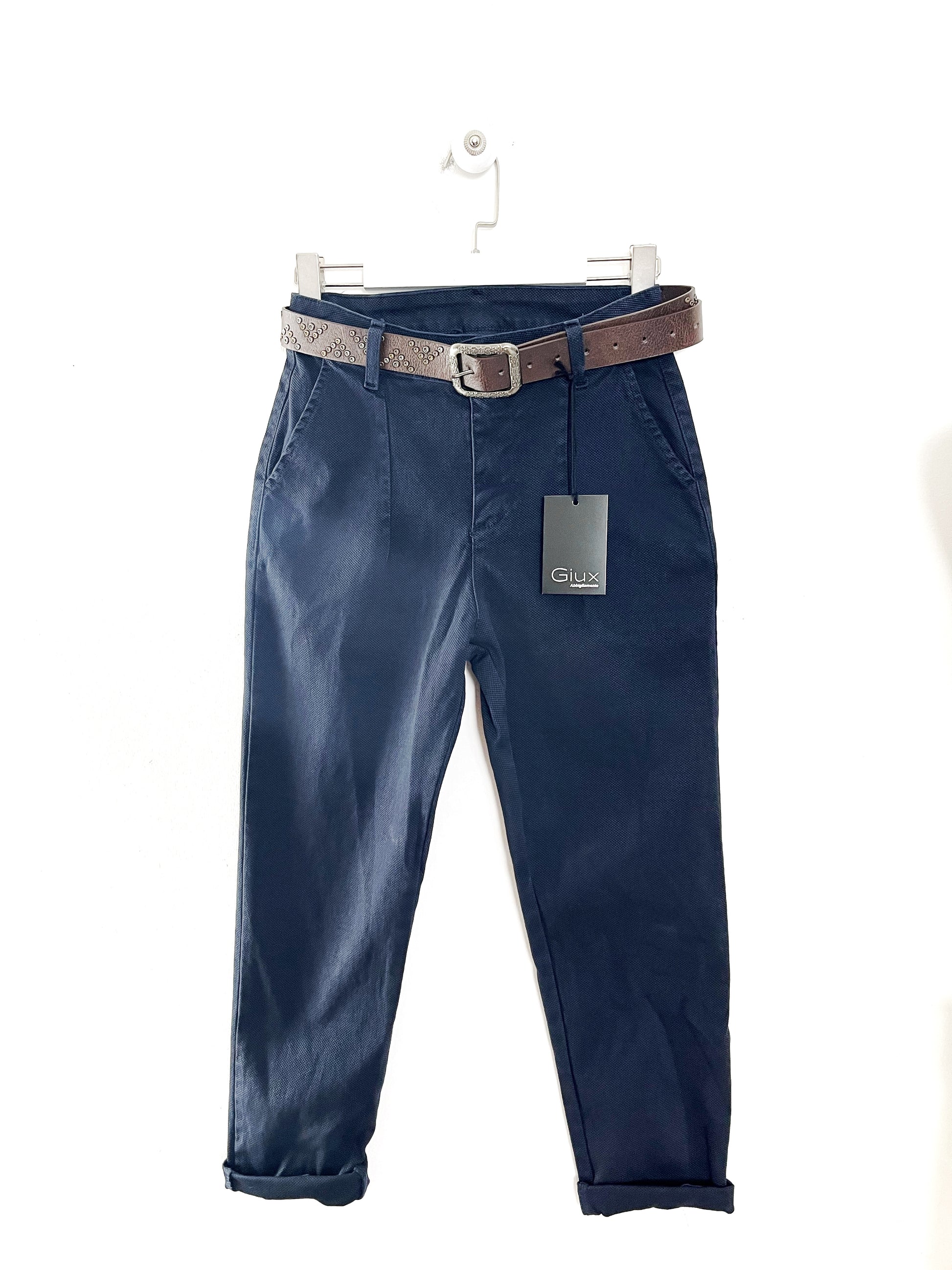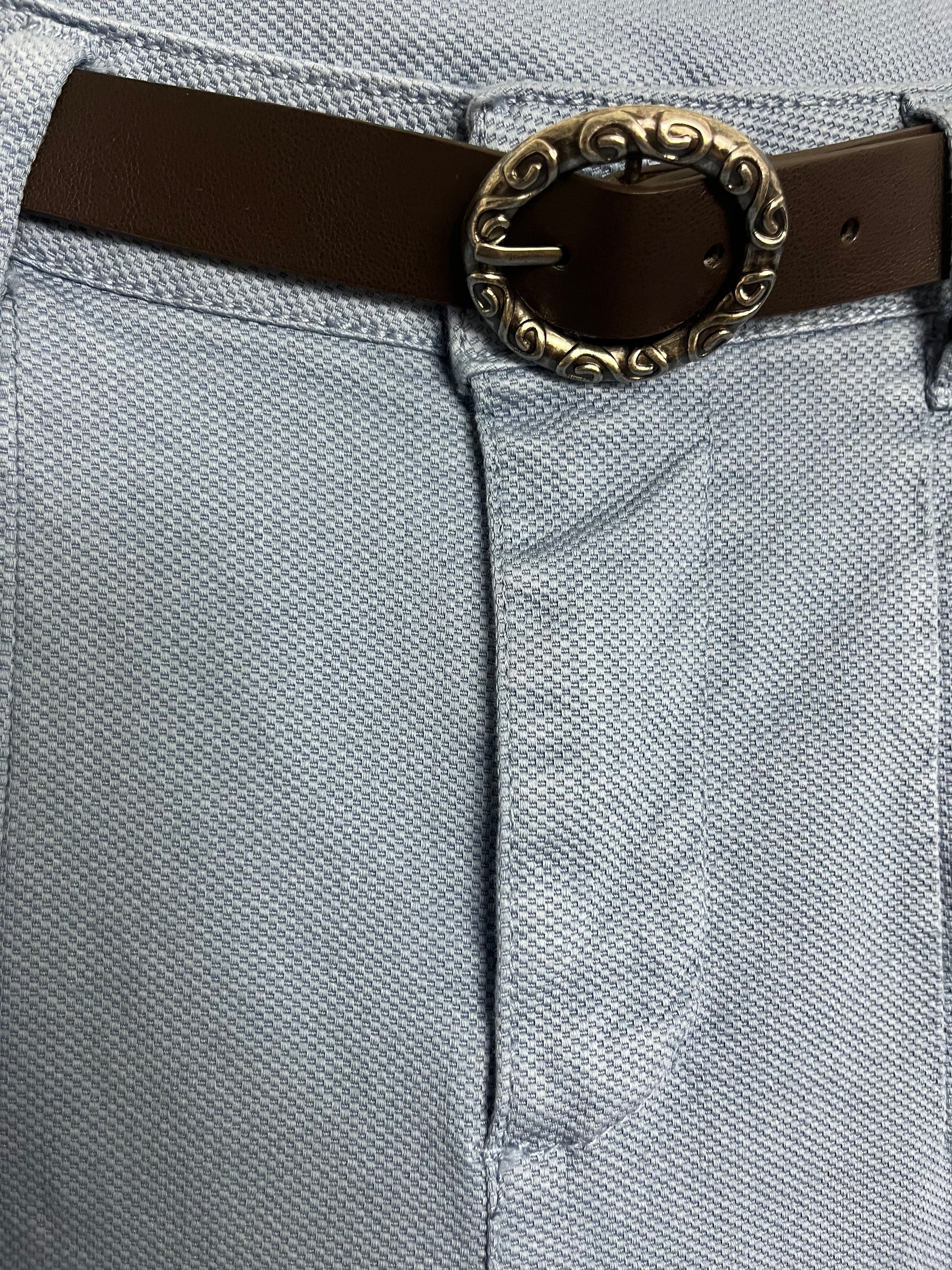 Pantalone in pique di cotone, tasche oblique e pence sul davanti. Vita alta, vestibilità morbida. Chiusura con bottone e cerniera. Due taschine finte sul retro. Cintura in dotazione.