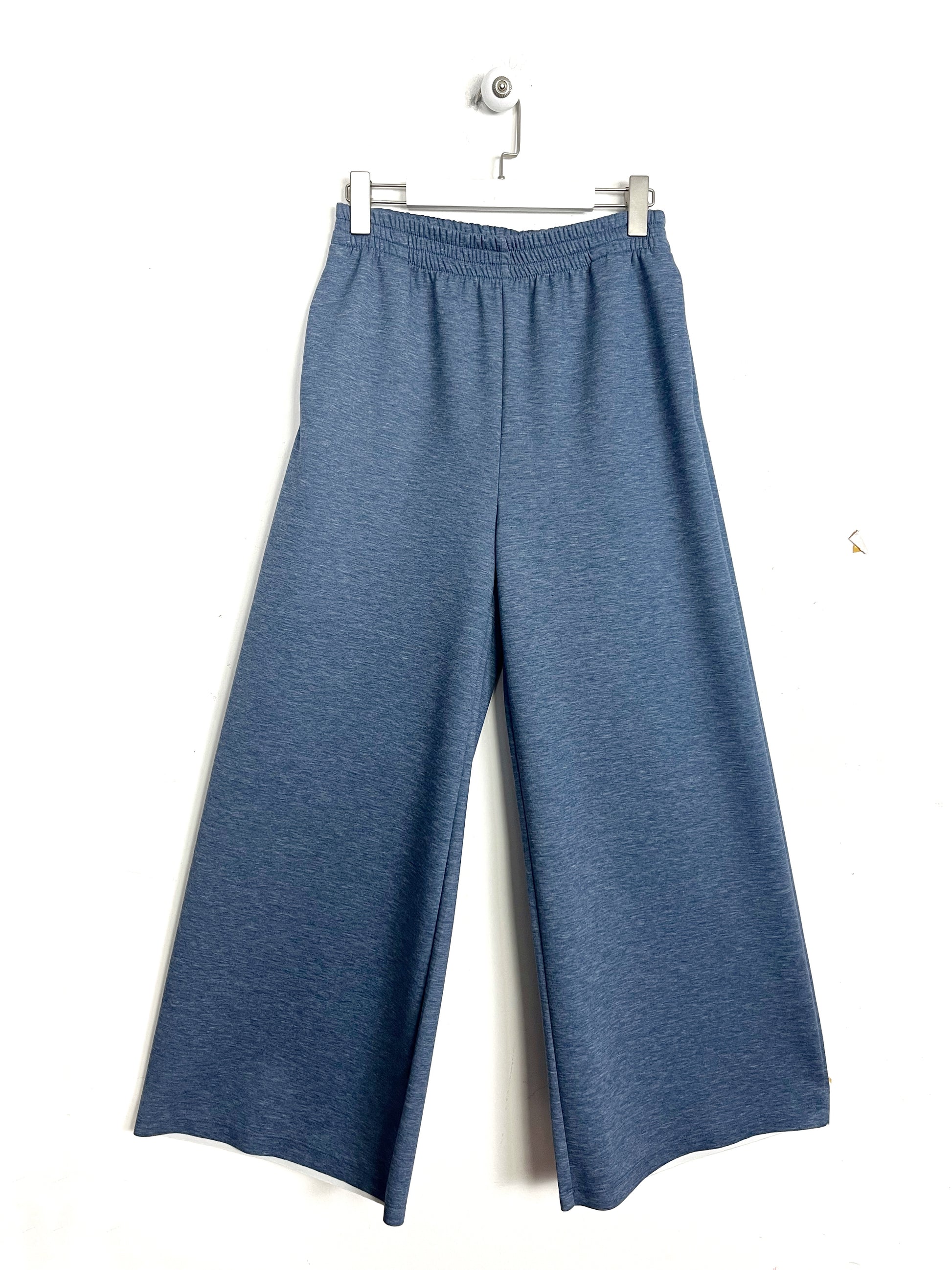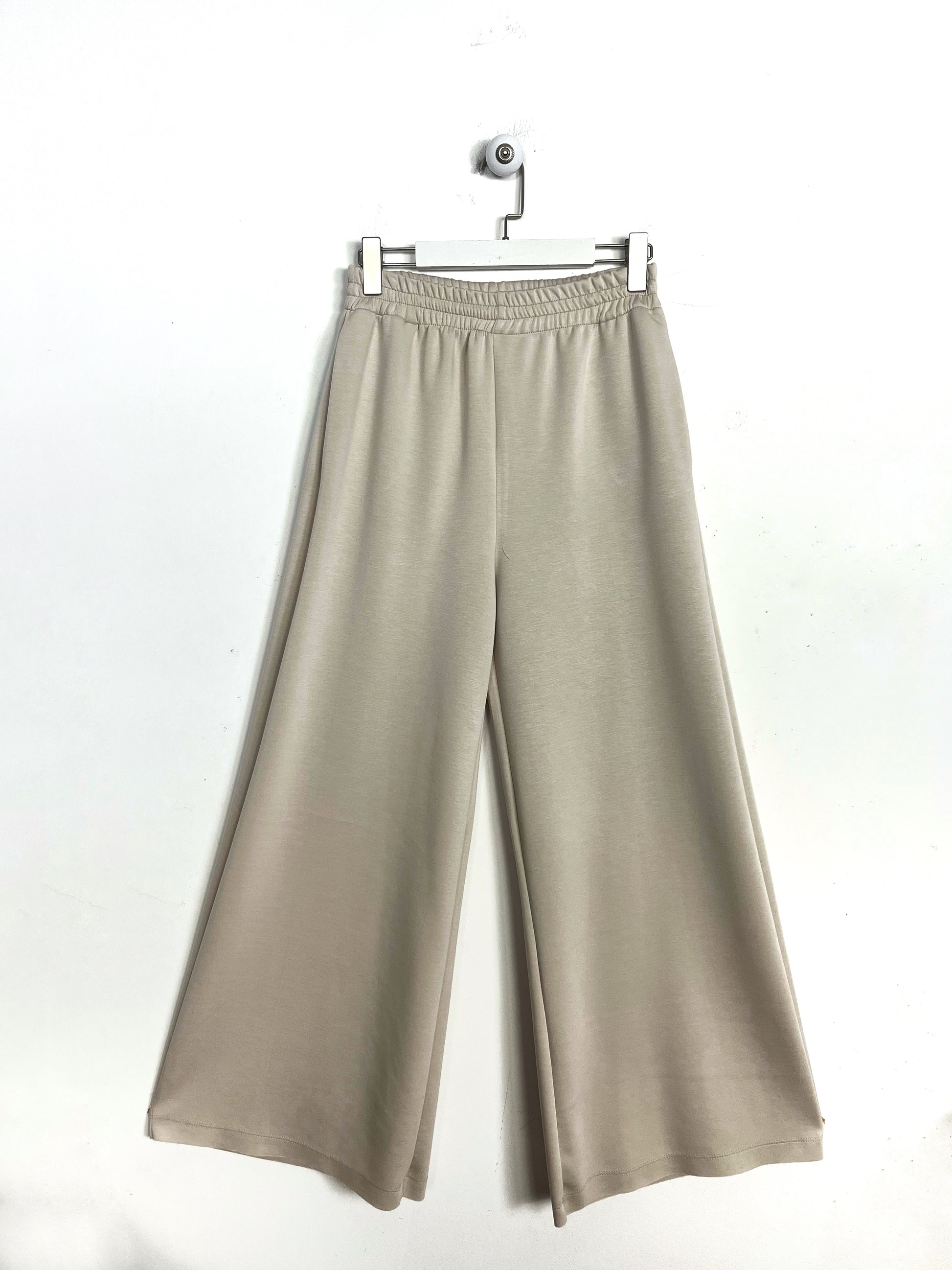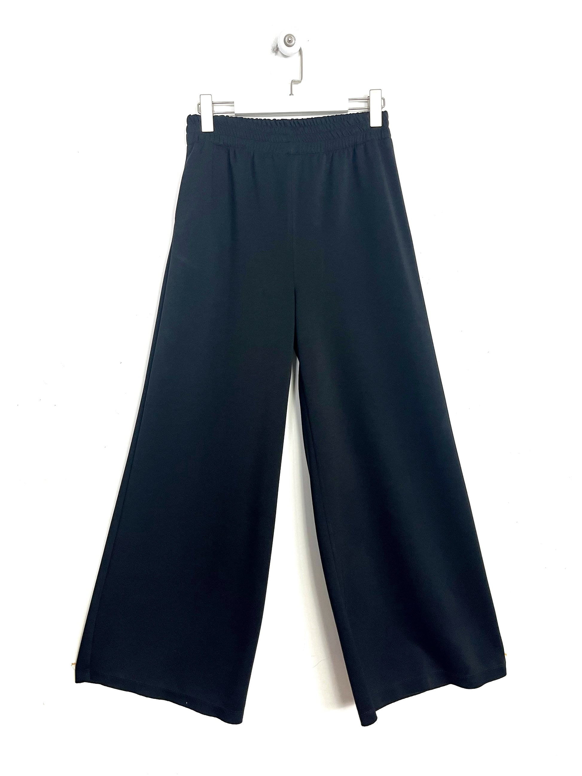 Pantalone in leggerissimo neoprene, gamba dritta e larga. Vita alta con elastico, tasche laterali a scomparsa.
