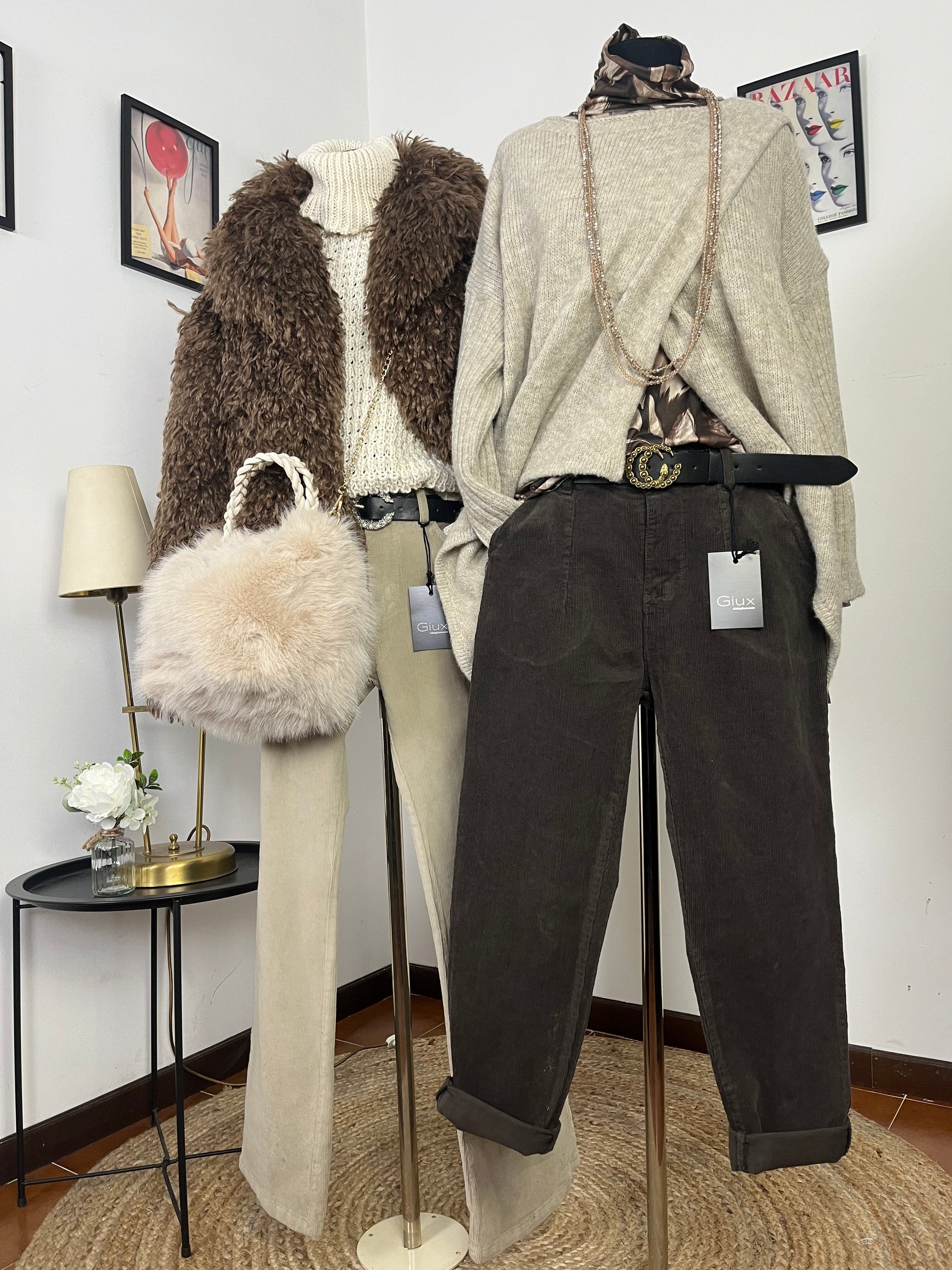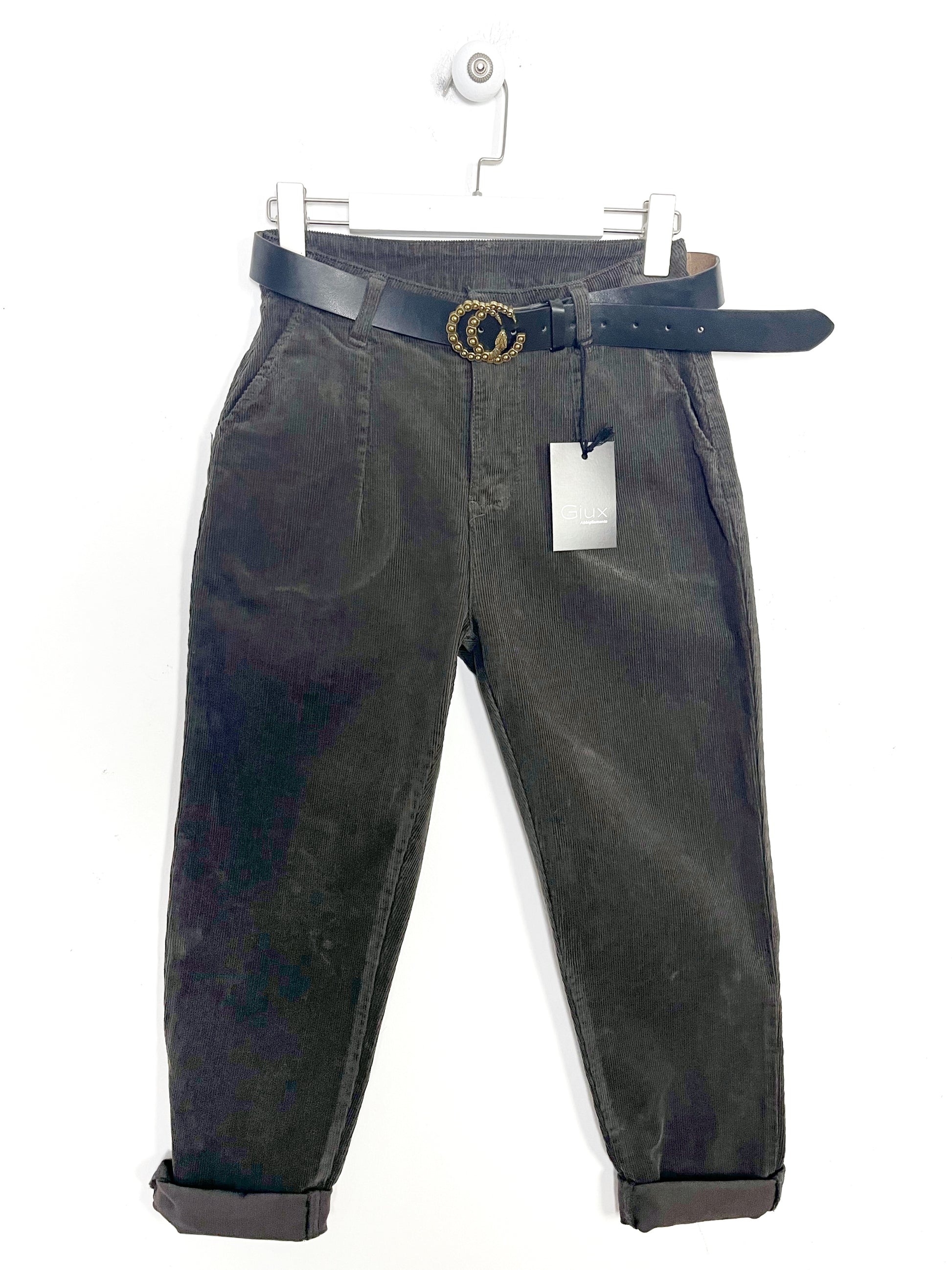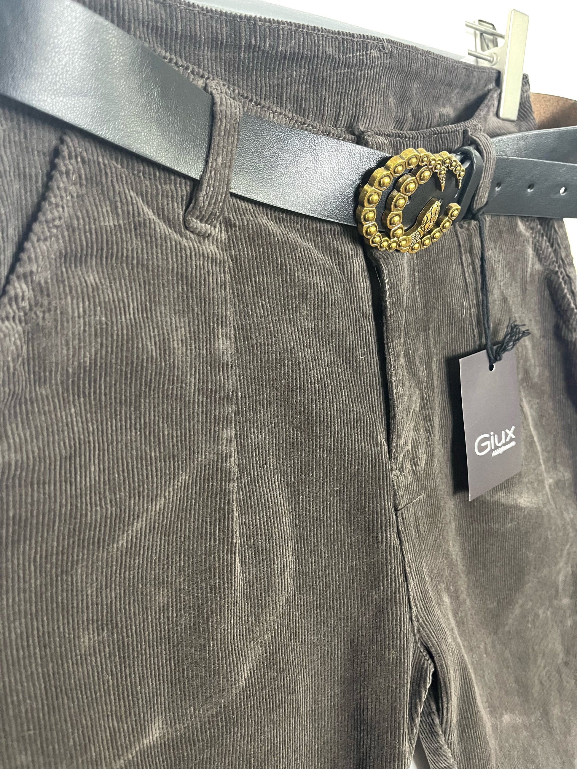Pantalone in velluto mille righe. Vita alta,cinturino con bottone e asola. Passanti con cinturina in ecopelle. 2 tasche davanti oblique. 2 tasche finte dietro