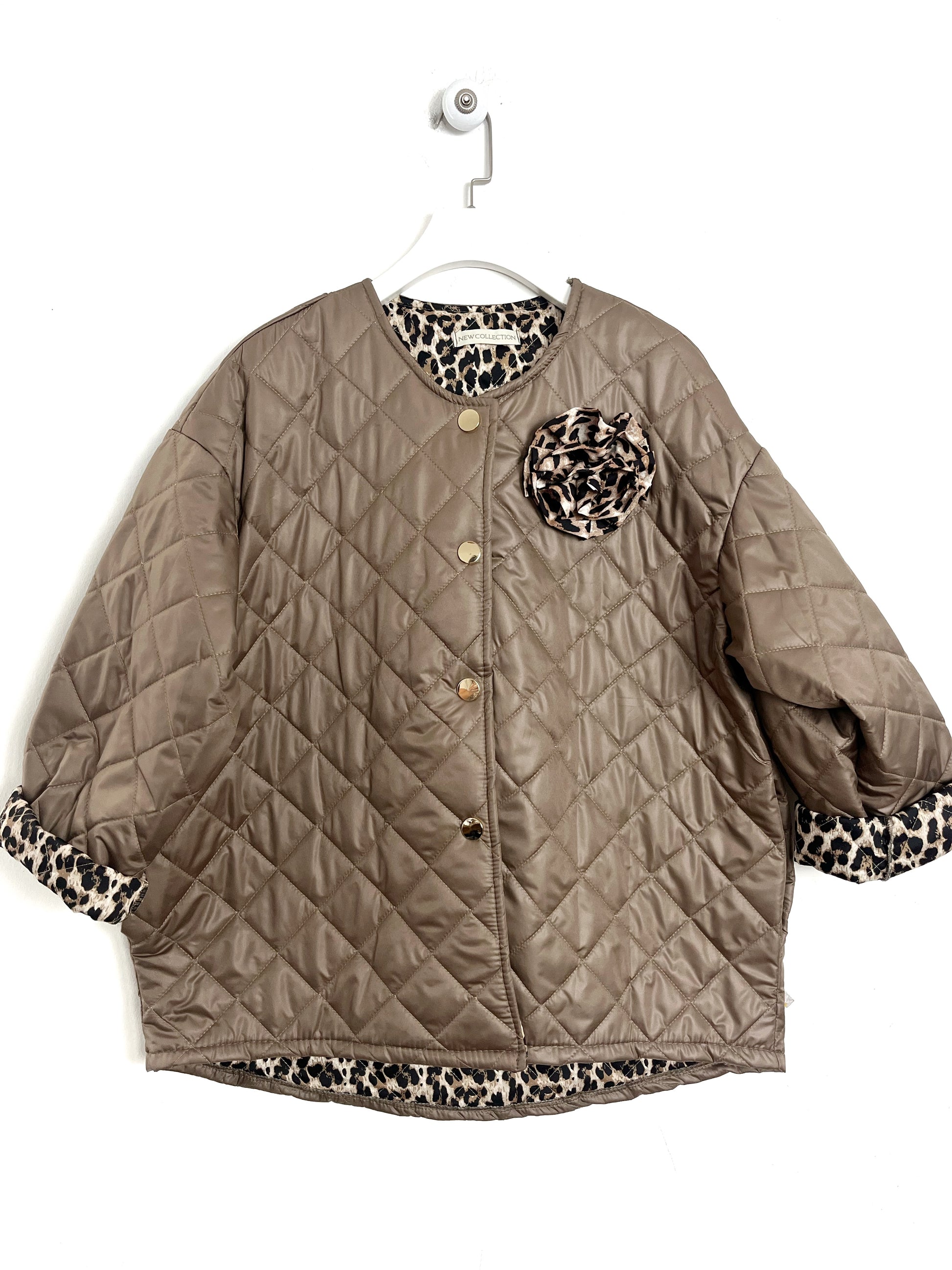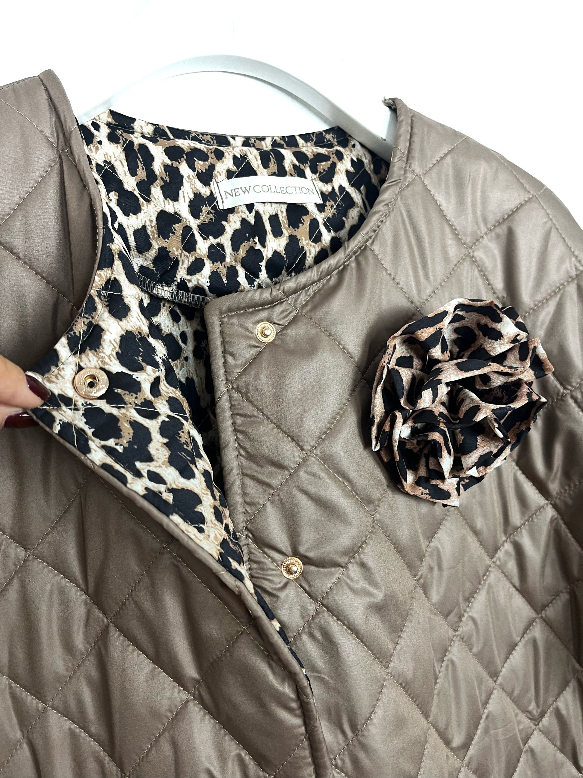 Piumino girocollo ultralight con bottoni a clip. Fodera interna maculata, spilla maculata. Due tasche laterali a scomparsa
