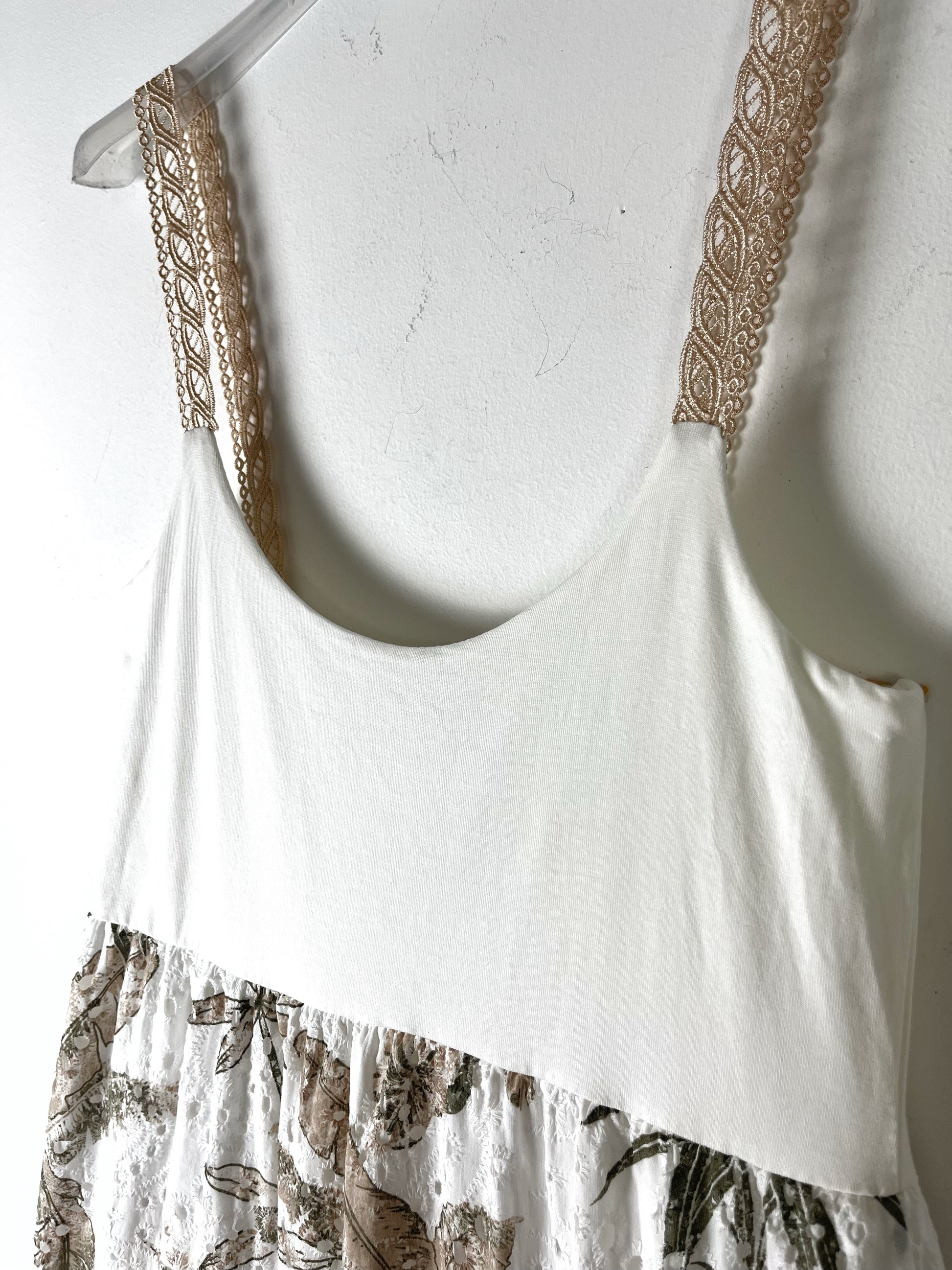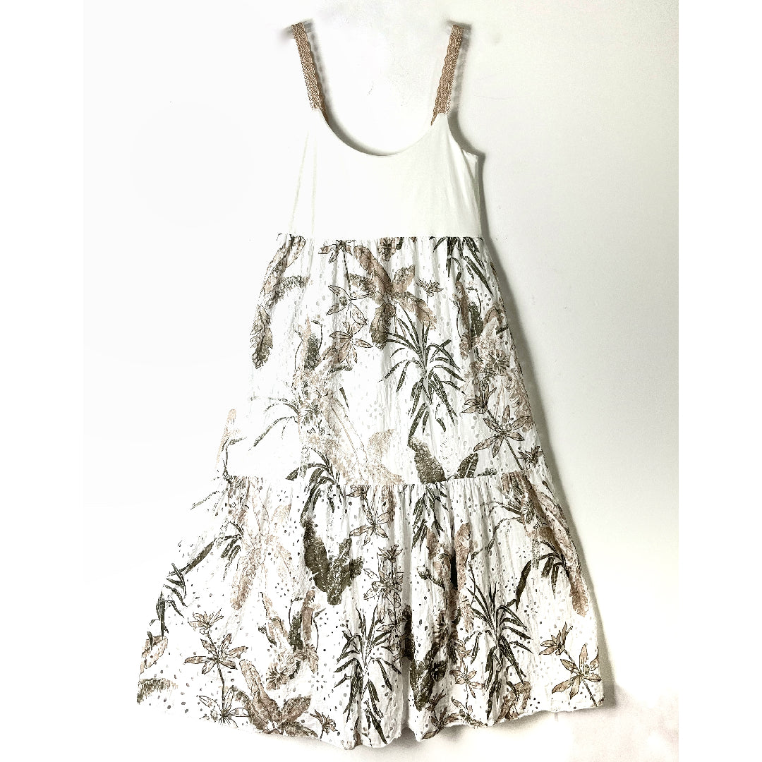 Abito in cotone con spalline ricamate. Corpetto in maglina di cotone. Gonna in sangallo di cotone fantasia a balze.