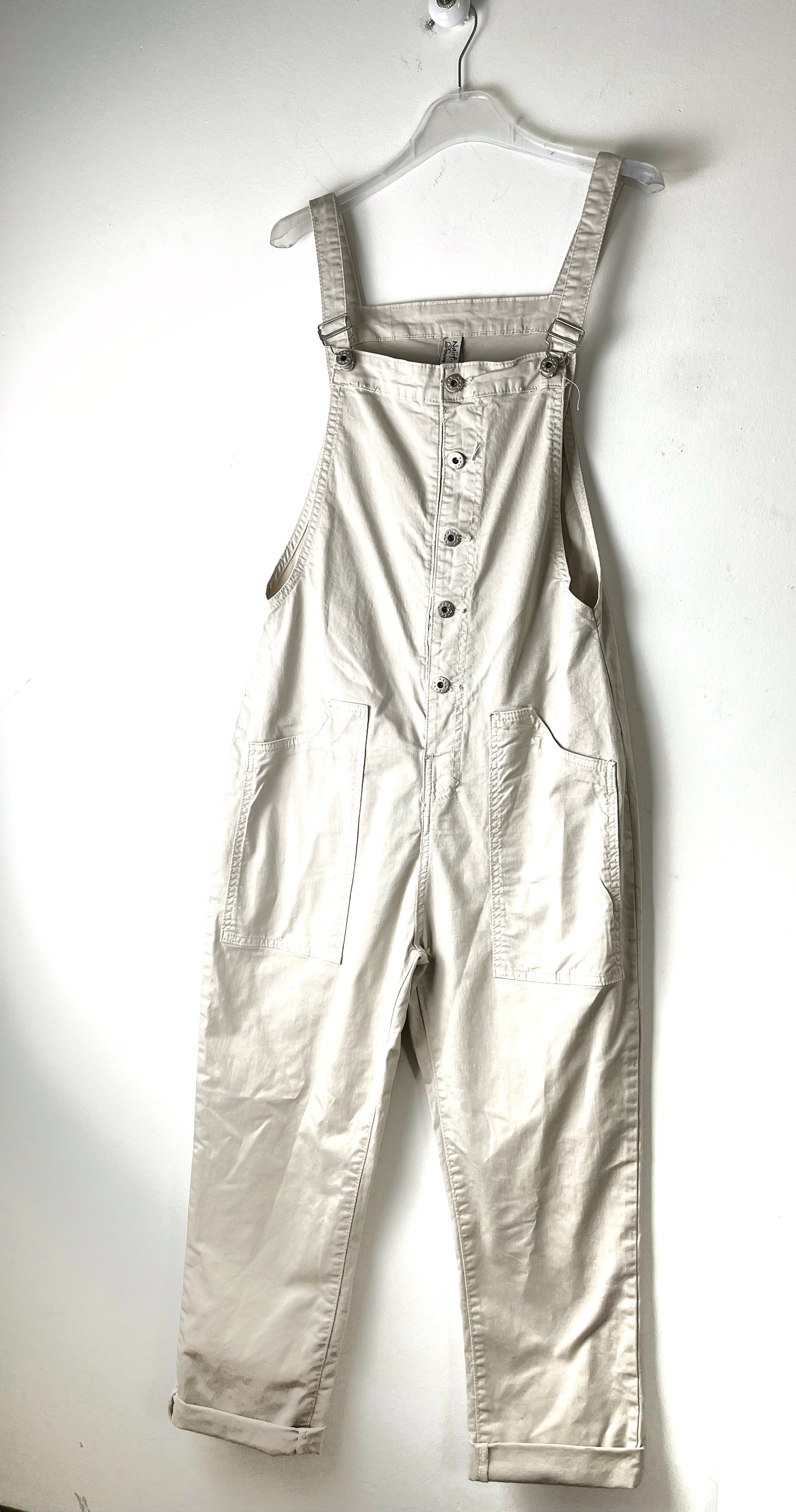 Salopette in cotone, abbottonata sul davanti fino alla vita. Due trasconi applicati sul davanti. Gamba affusolata, da portare lunga o risvolterà. Cinghie regolabili. Due tasche dietro.