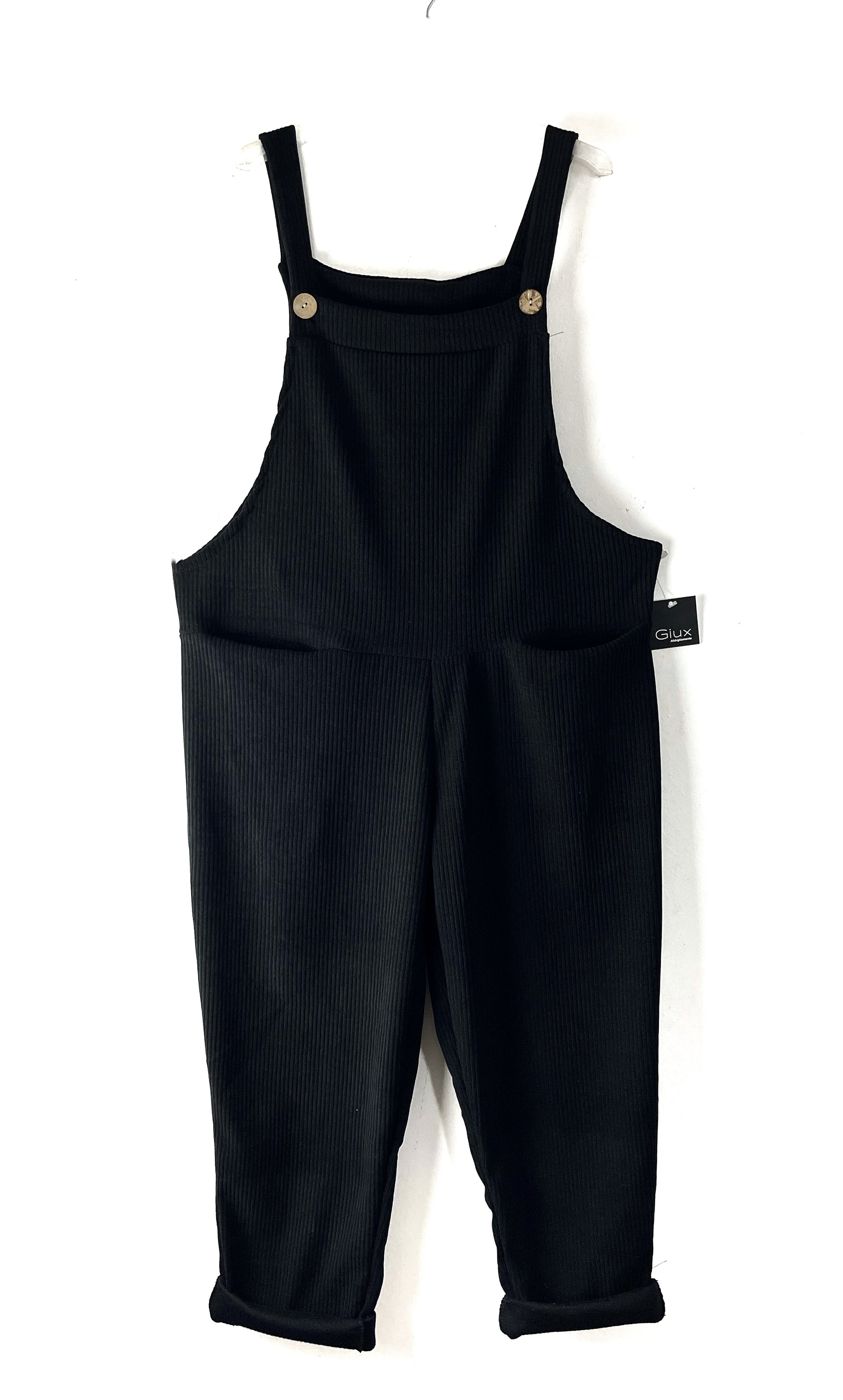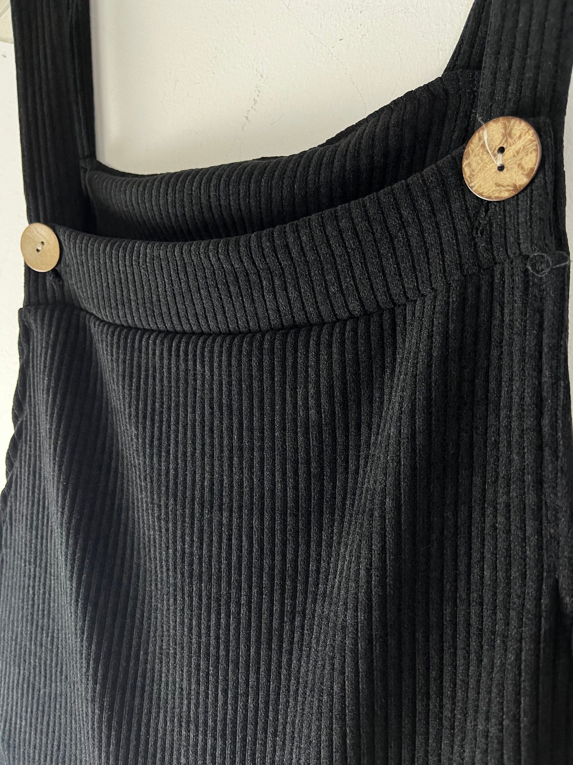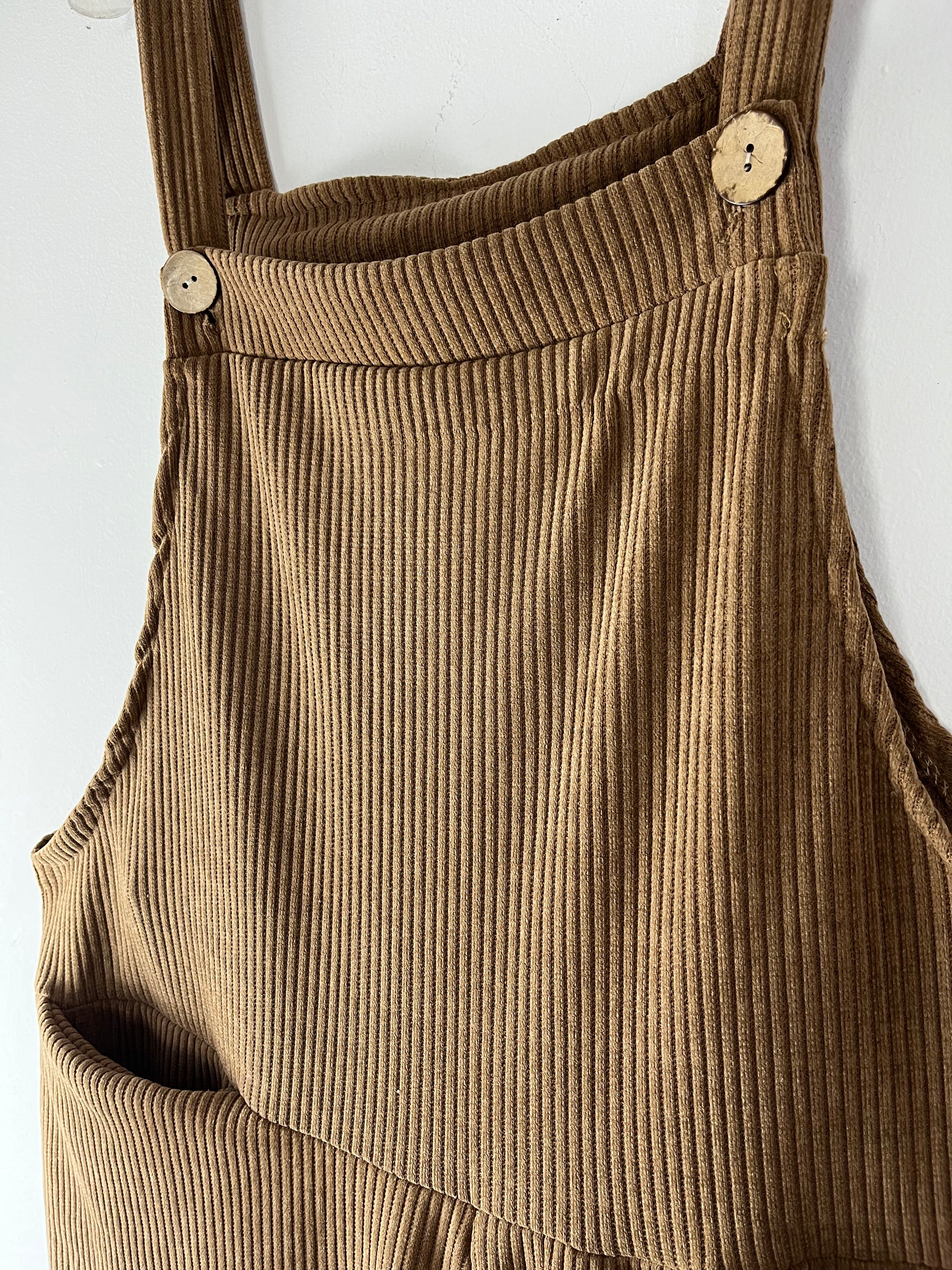 Salopette in velluto a coste, gamba larga e morbida, da portare anche risvoltata. Cavallo basso. Spallotta regolabile spostando il bottone. 2 tasche a scomparsa sul davanti.