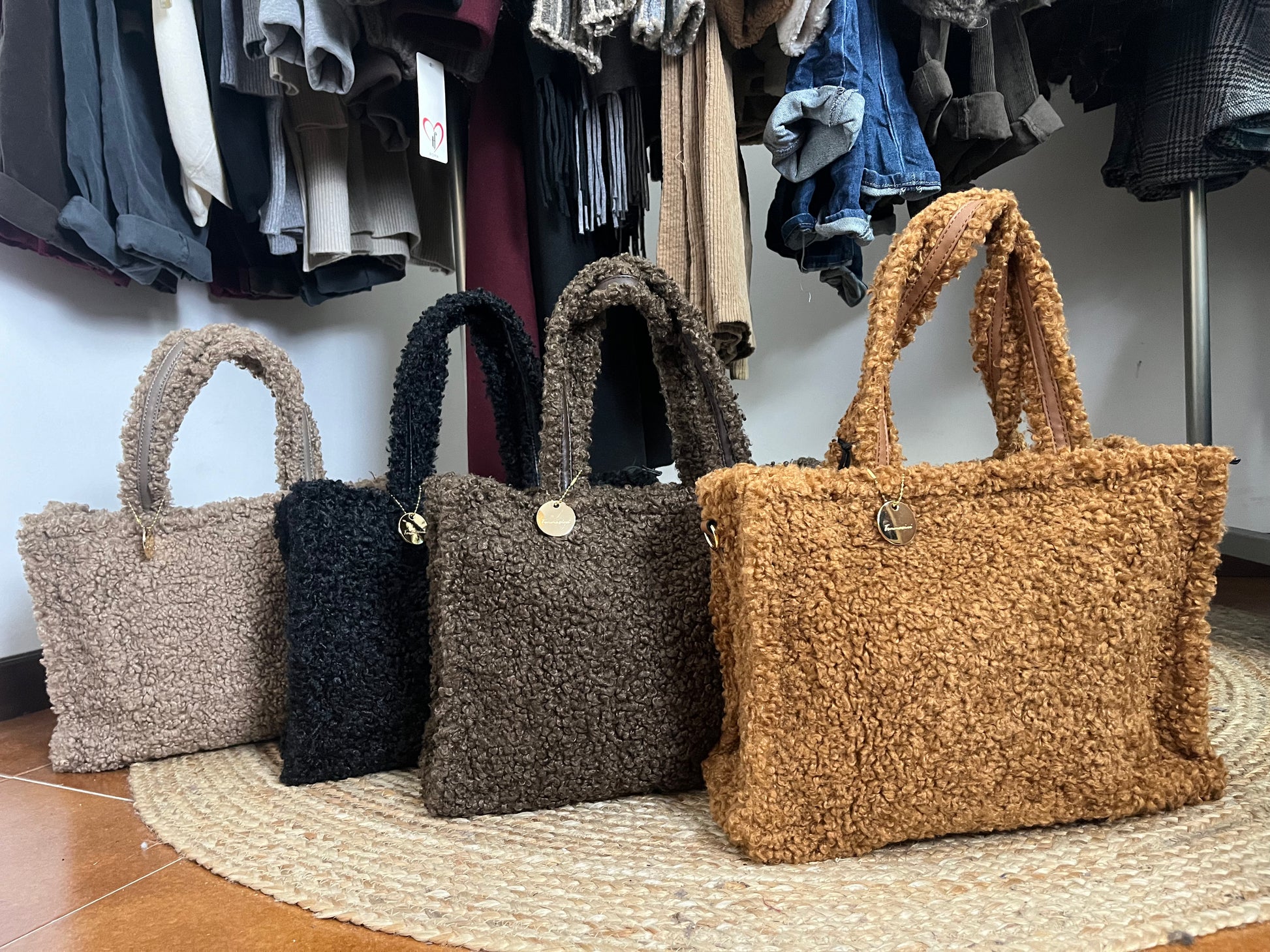 Borsa in tessuto orsetto. Chiusura con cerniera. Manici con inserti in ecopelle. Tracolla In ecopelle