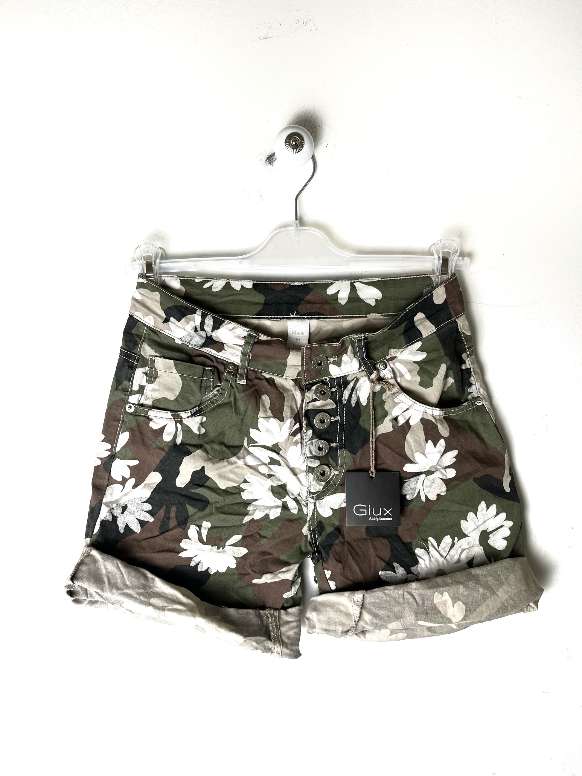 Shorts in leggerissimo cotone elasticizzato, 5 tasche. Patta con bottoni, no cerniera. Vita alta.