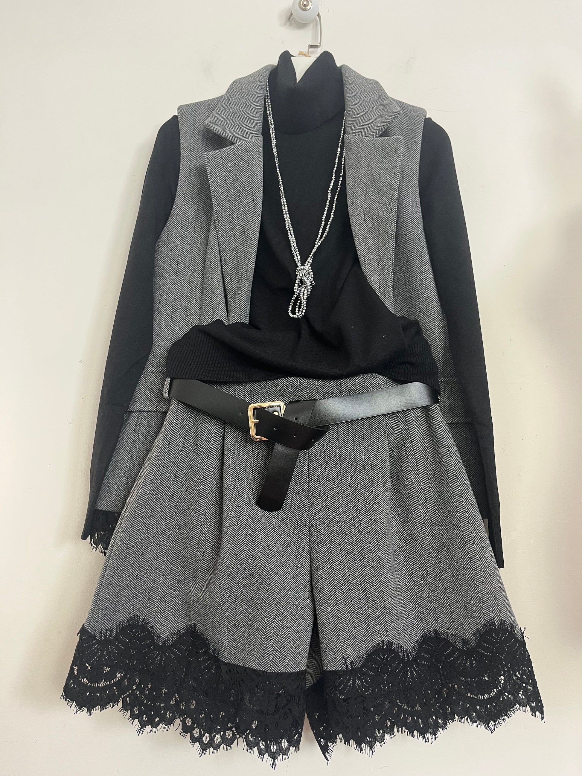 Pantaloncini in tessuto spigato con elastico in vita dietro, liscio davanti, con passanti e cintura. Pizzo applicato sul fondo