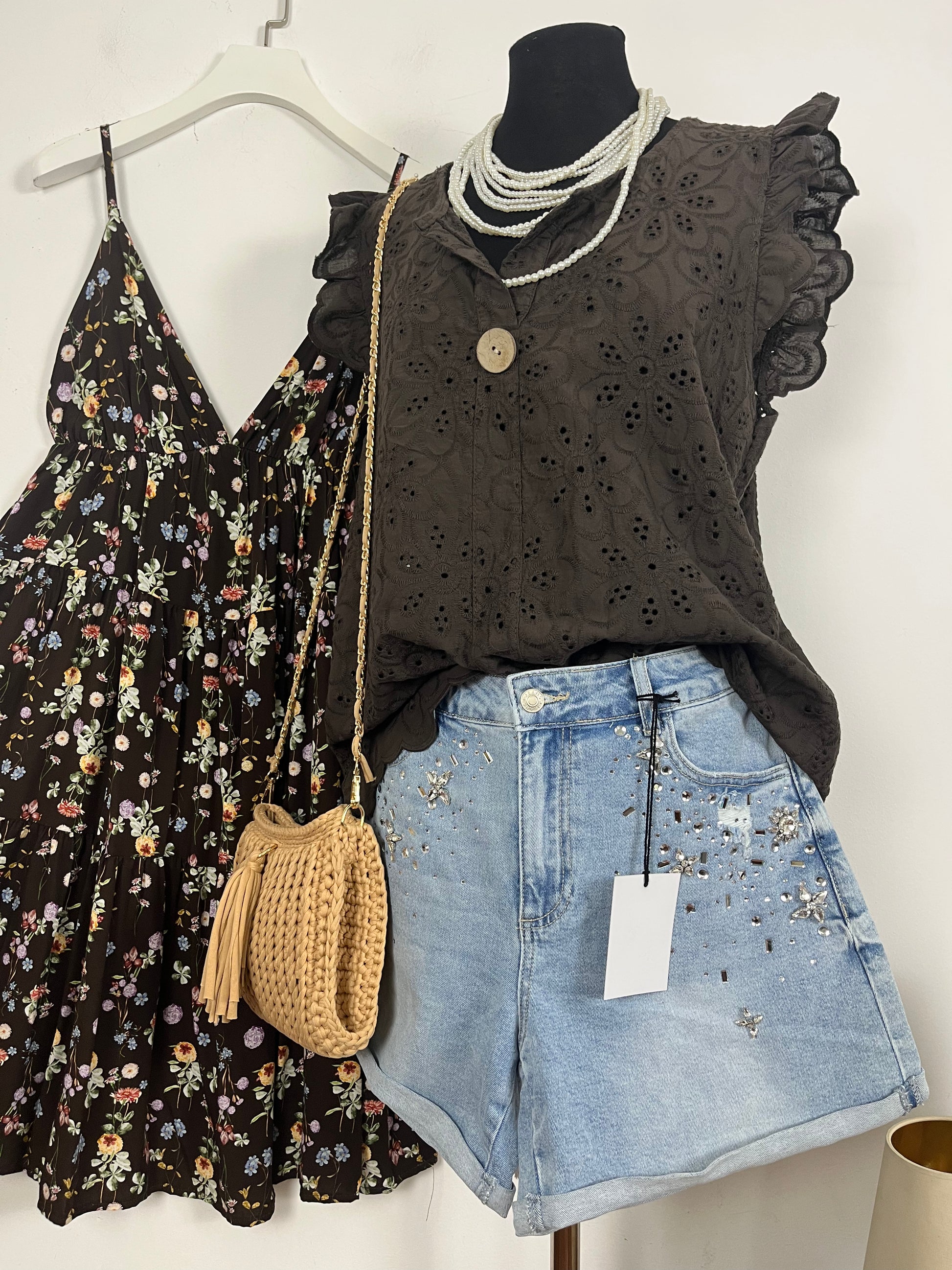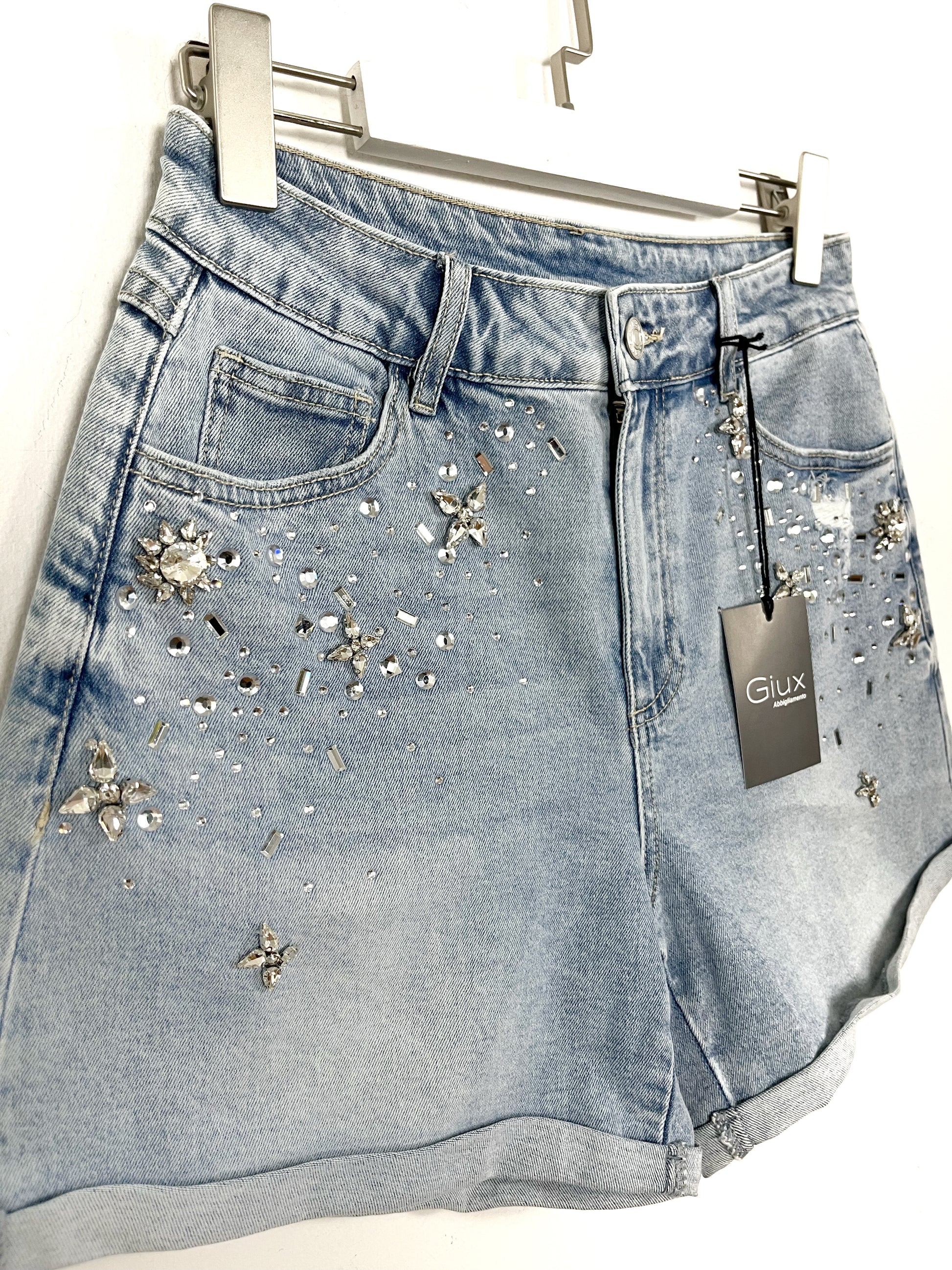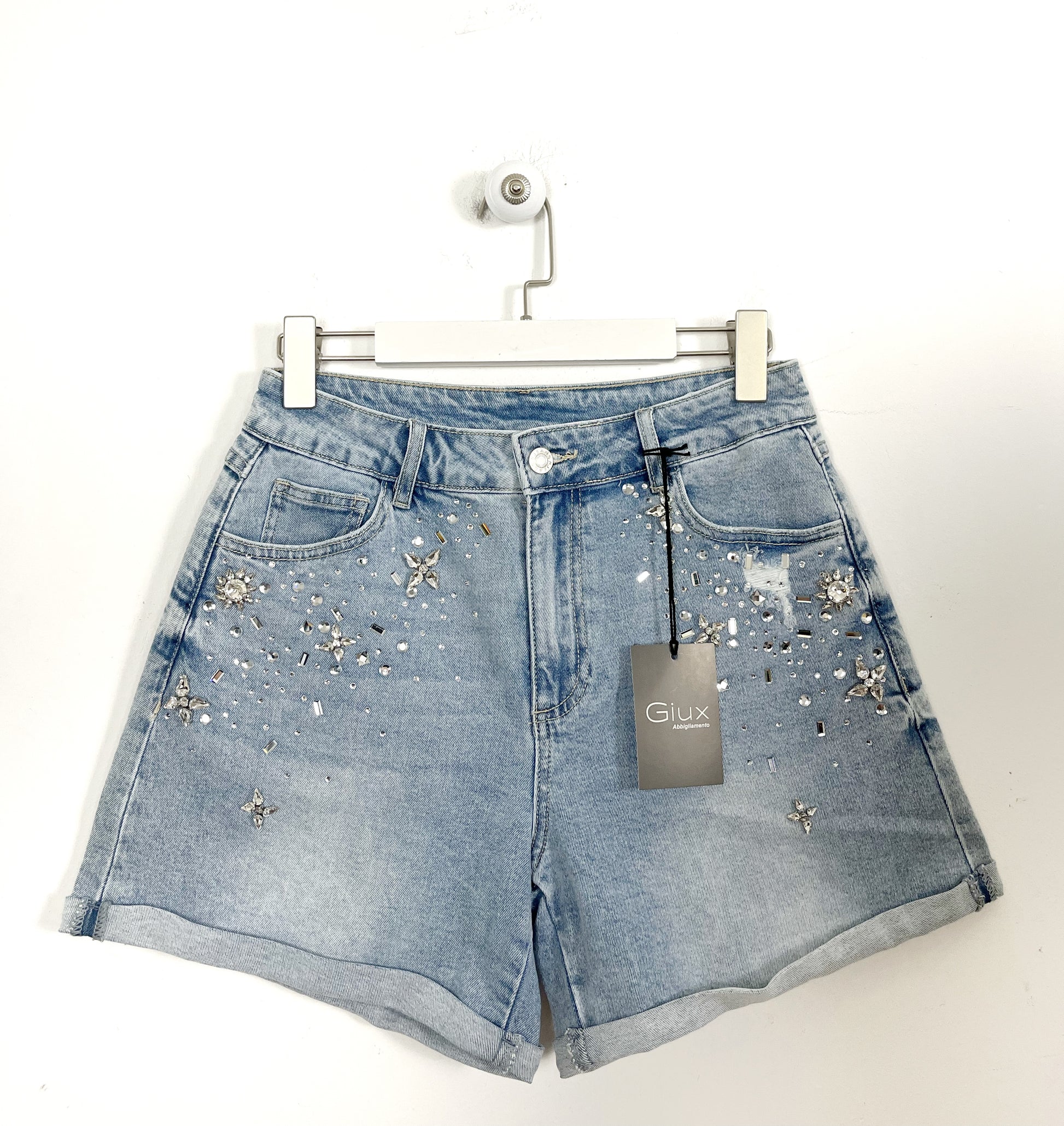 Shorts in jeans chiaro leggermente sbiadito, 5 tasche. Vita alta con bottone e cerniera, strass applicati e cuciti. Risvoltino.