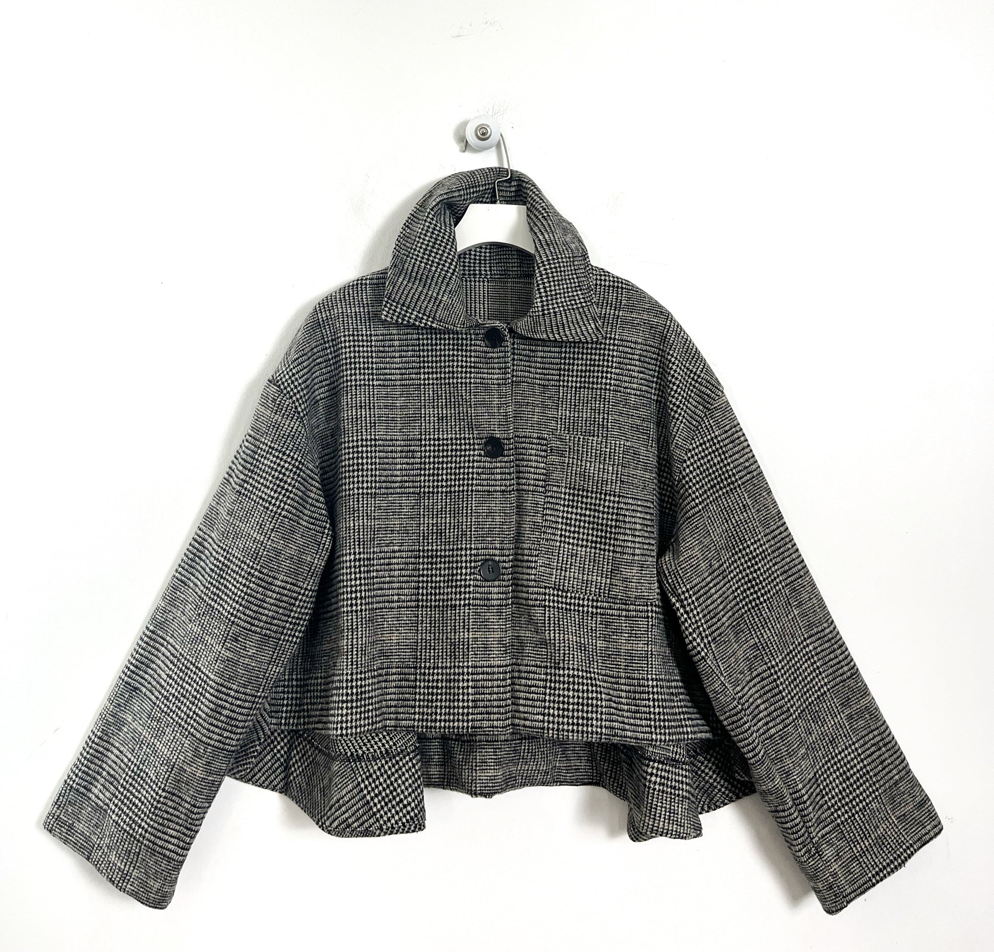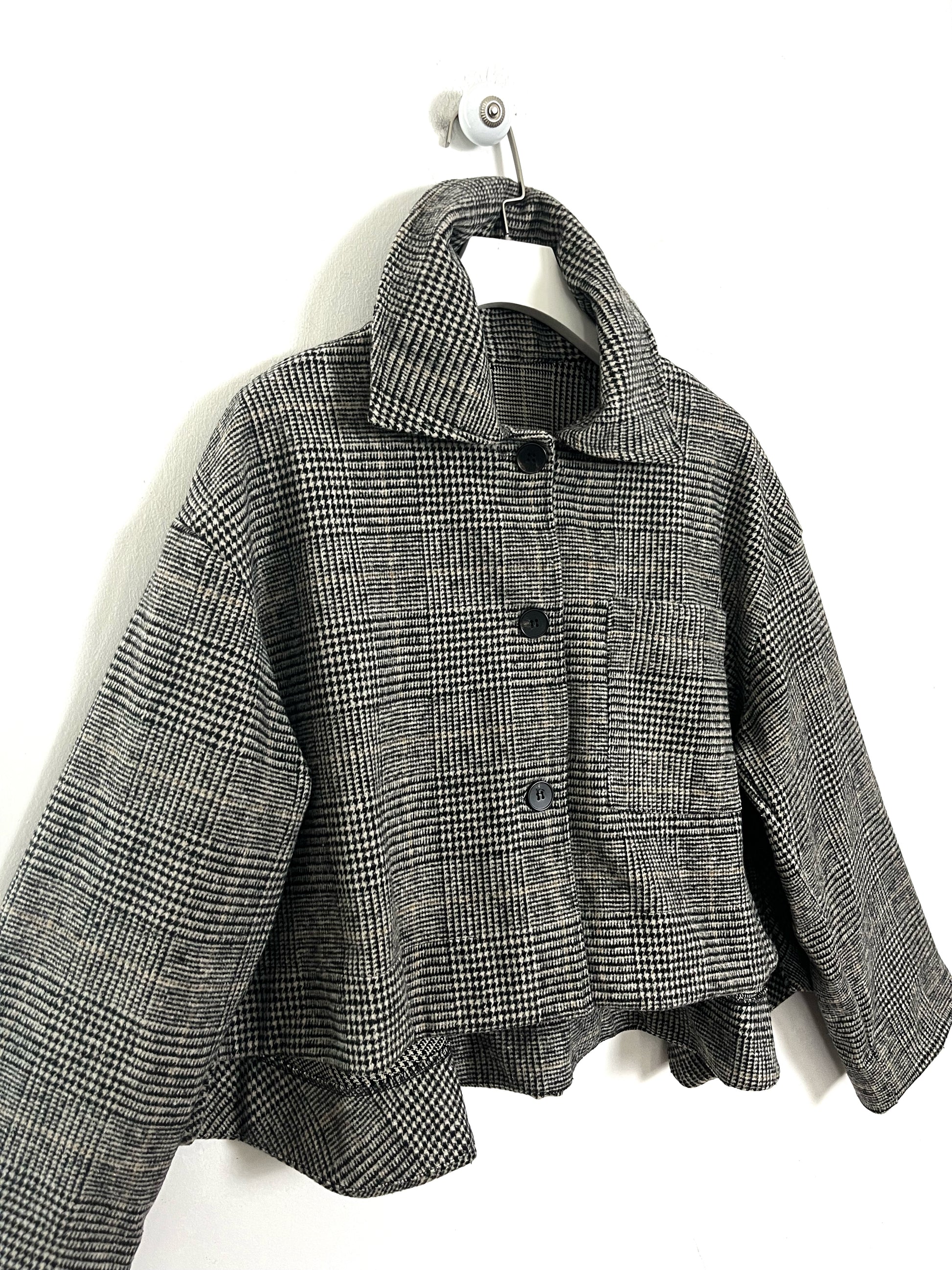 Simil Trench corto in tessuto. Fantasia in pied de poule. Manica Lunga, chiusura con i bottoni e asole. Spalla ribassata. Stondato sul retro. Sfoderato
