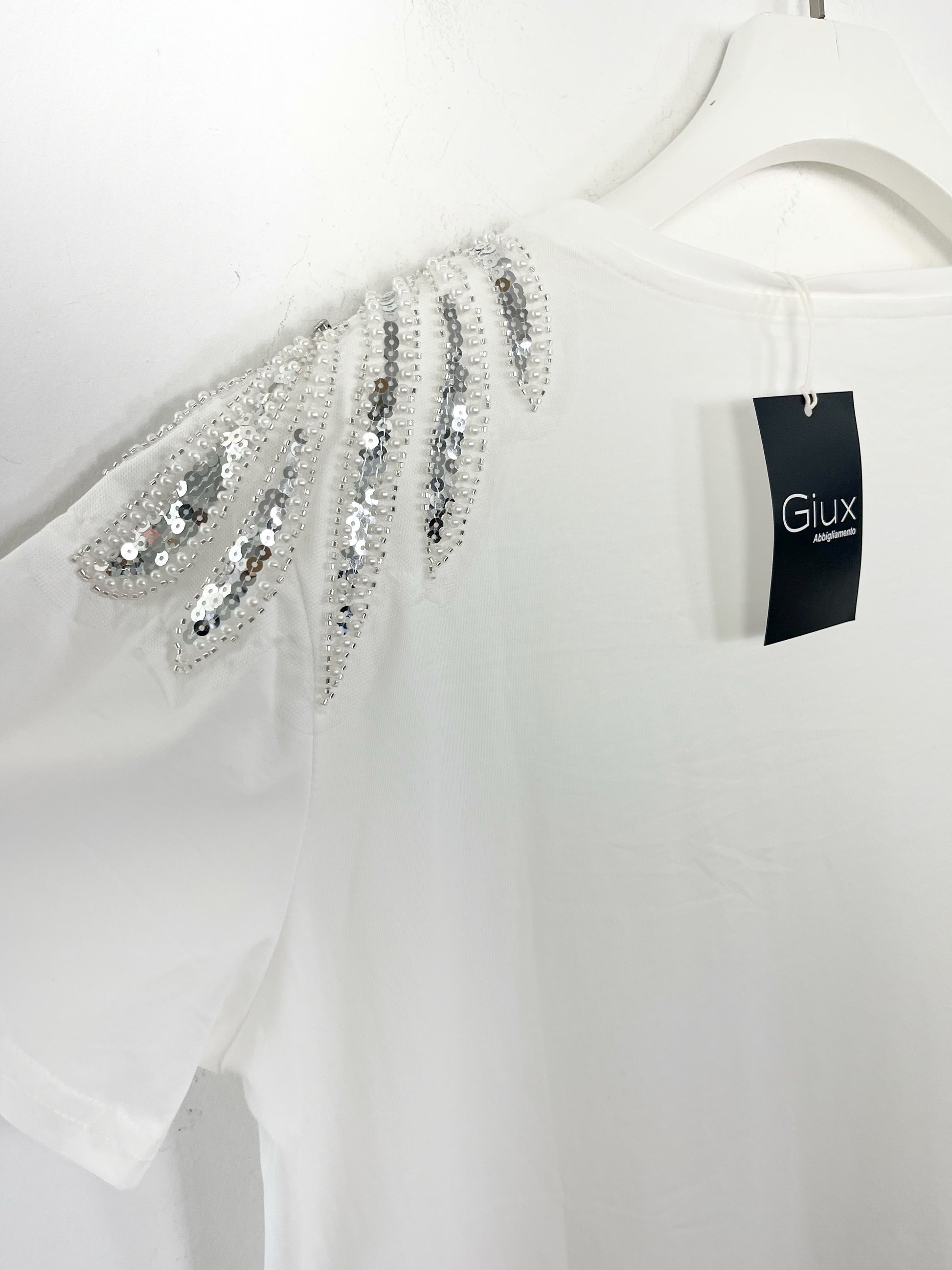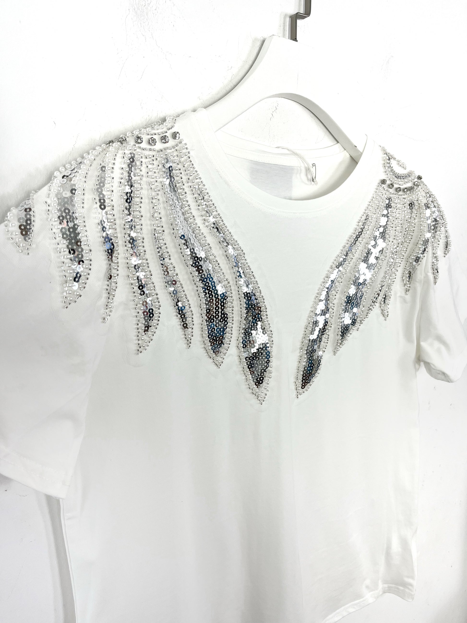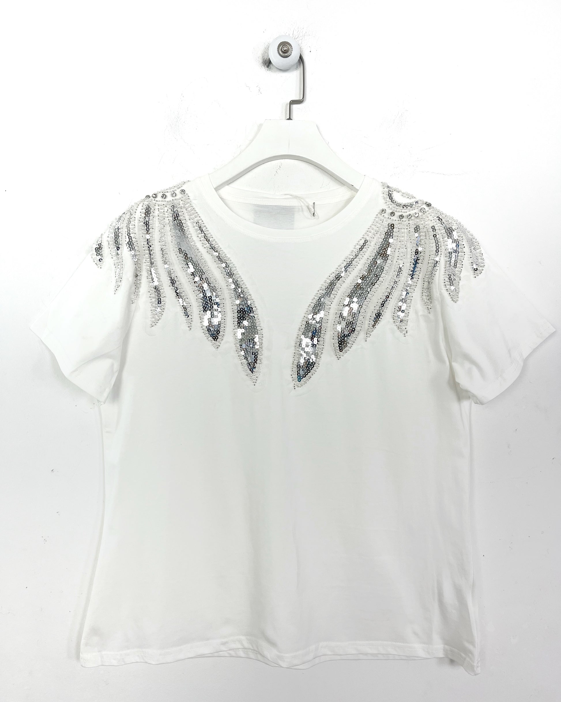 T-shirt mezza manica con strass e paillettes sulle spalle. Cotone elasticizzato.