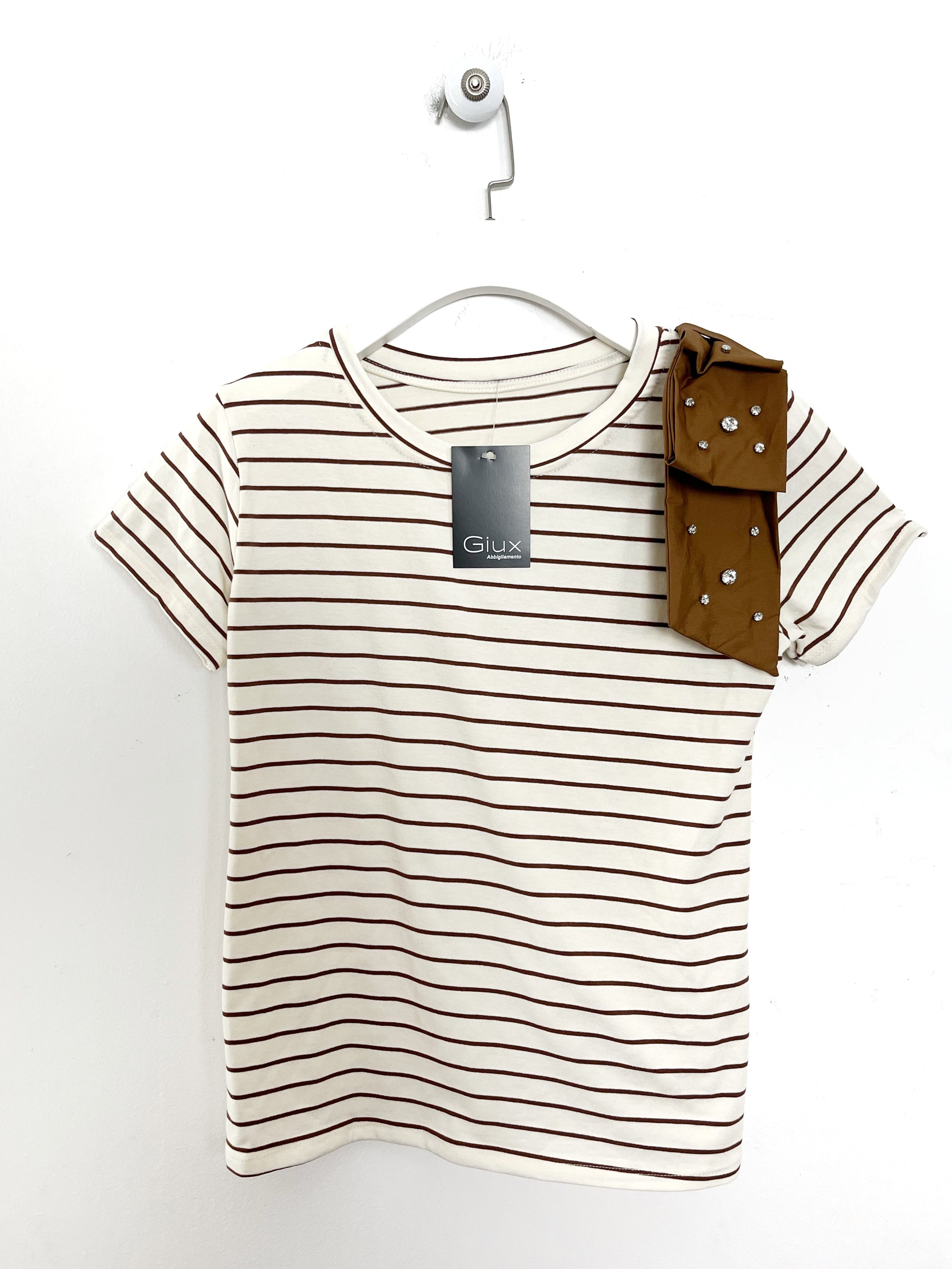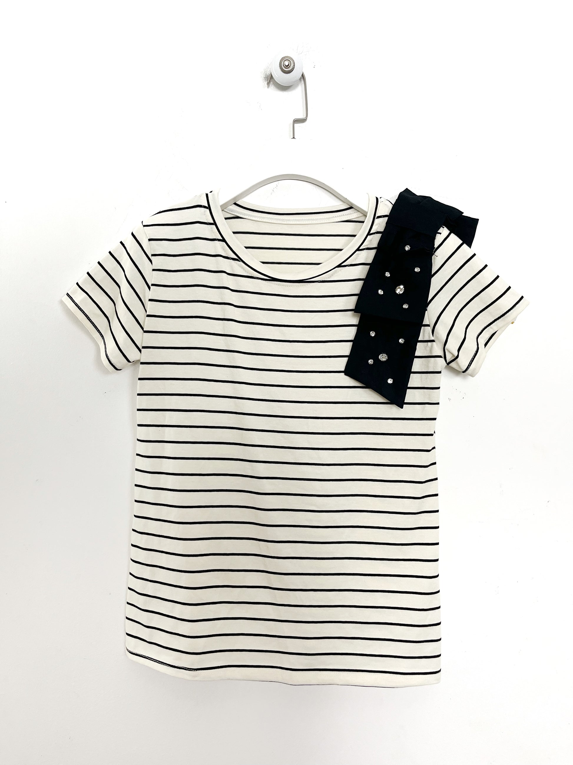 T-shirt in morbido cotone rigata, girocollo. Fiocco in tessuto applicato sulla spalla con strass