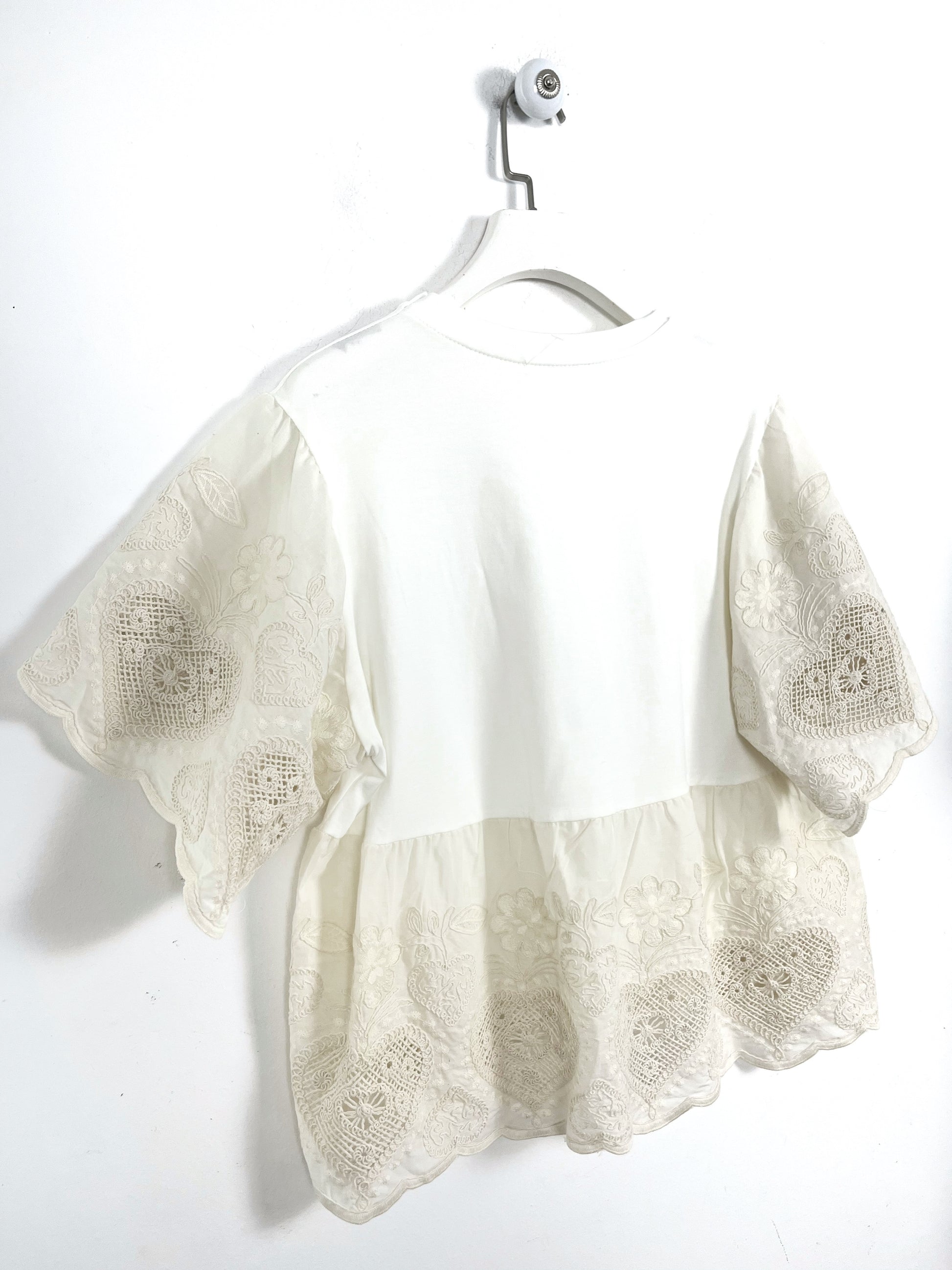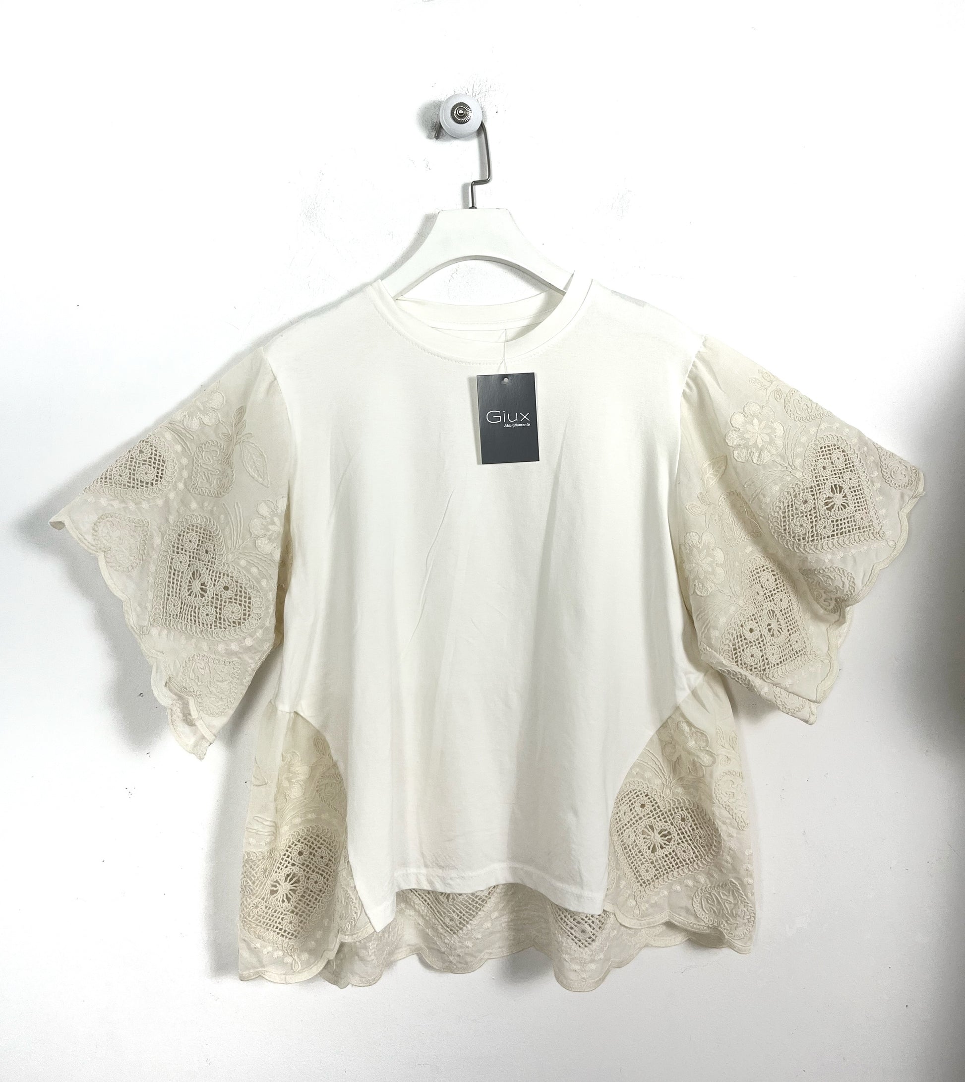 T-shirt in cotone elasticizzato. Girocollo. Pizzo Sangallo sulle maniche e dietro metà schiena.
