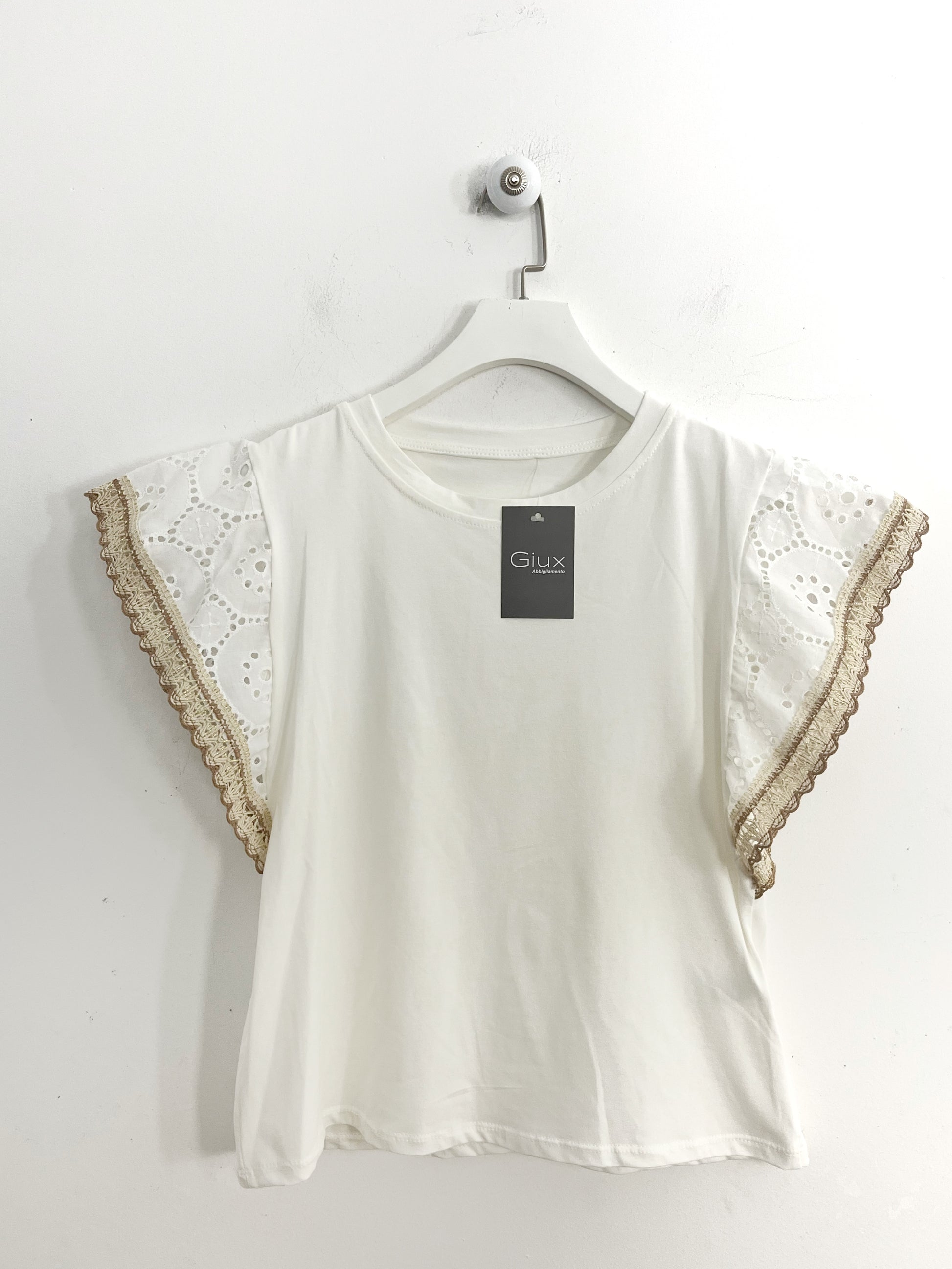 T-shirt con mezza manica in pizzo sangallo. Cotone elasticizzato.