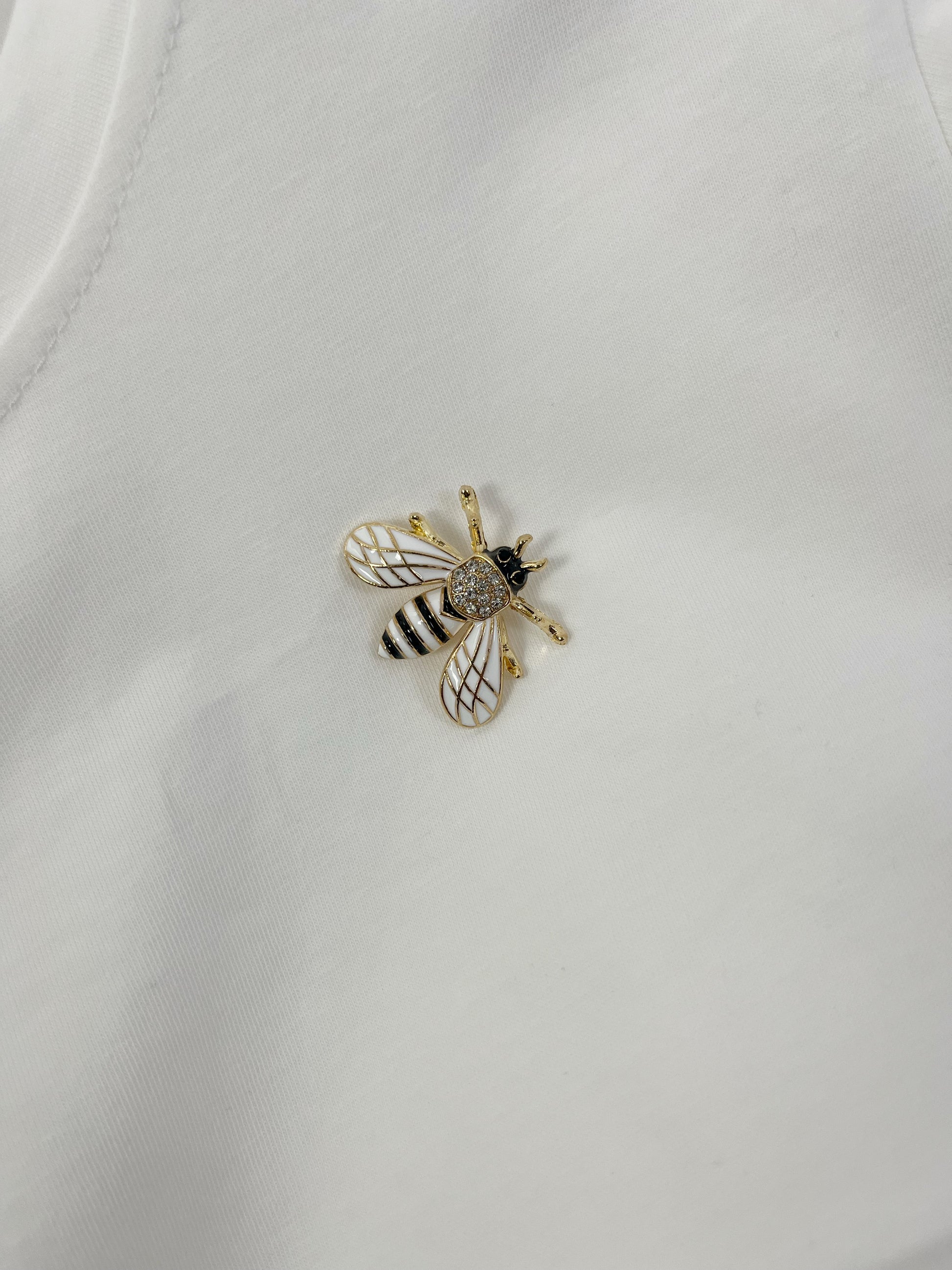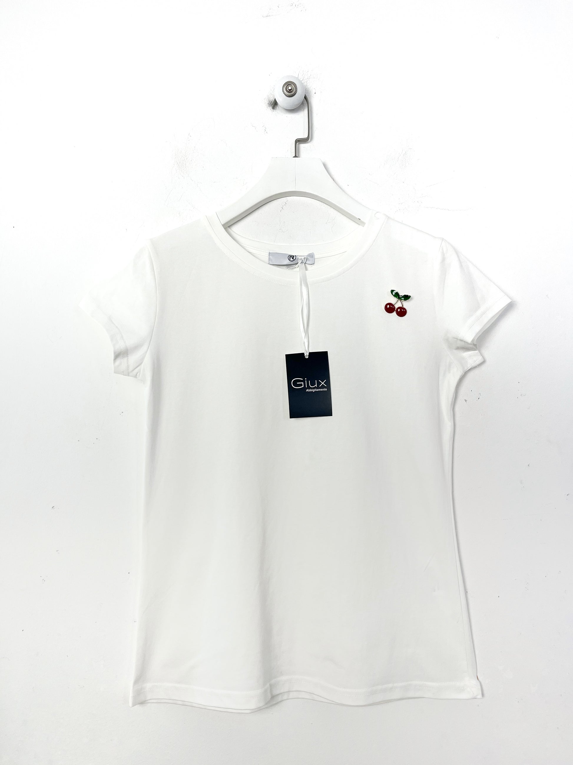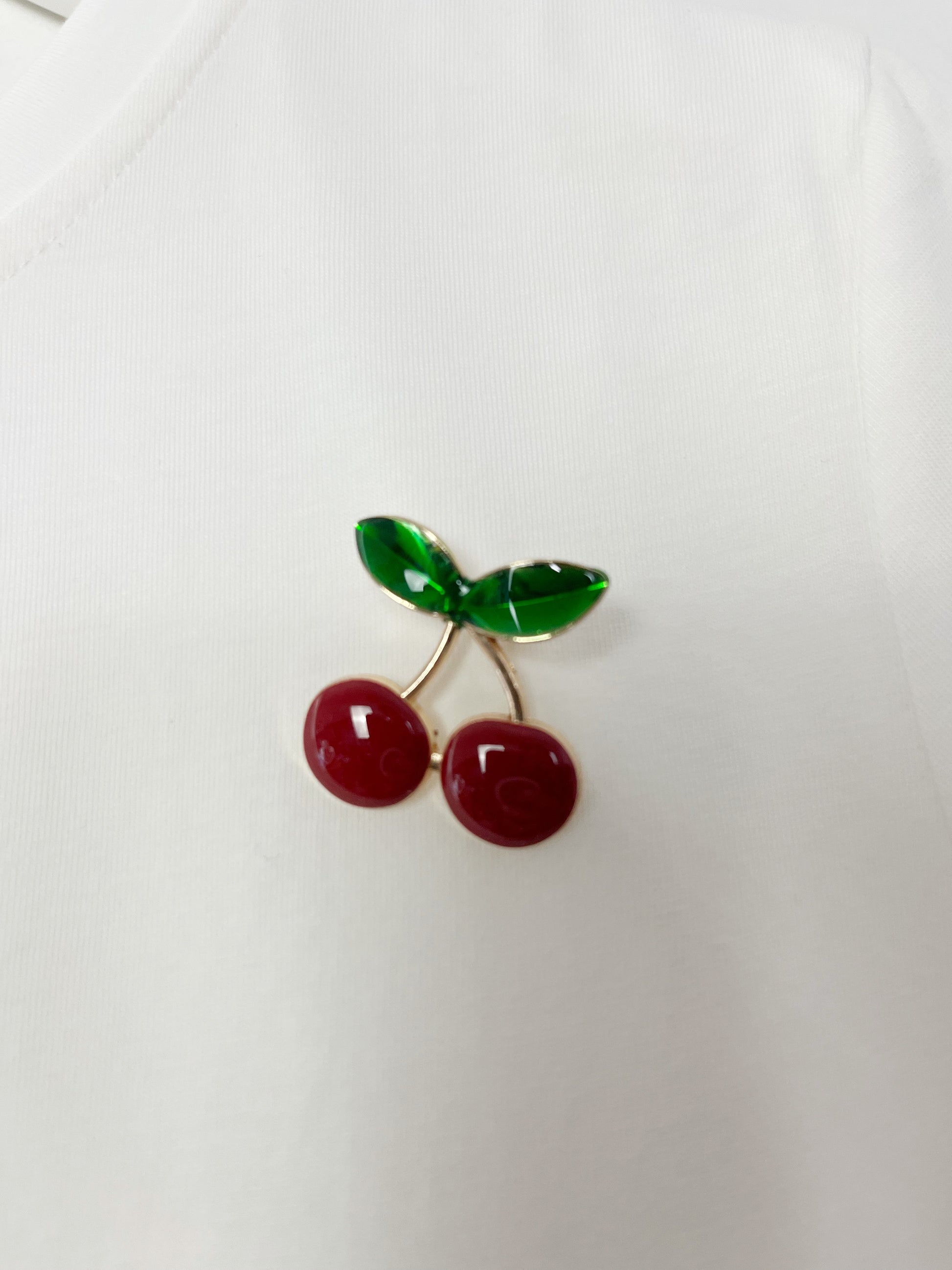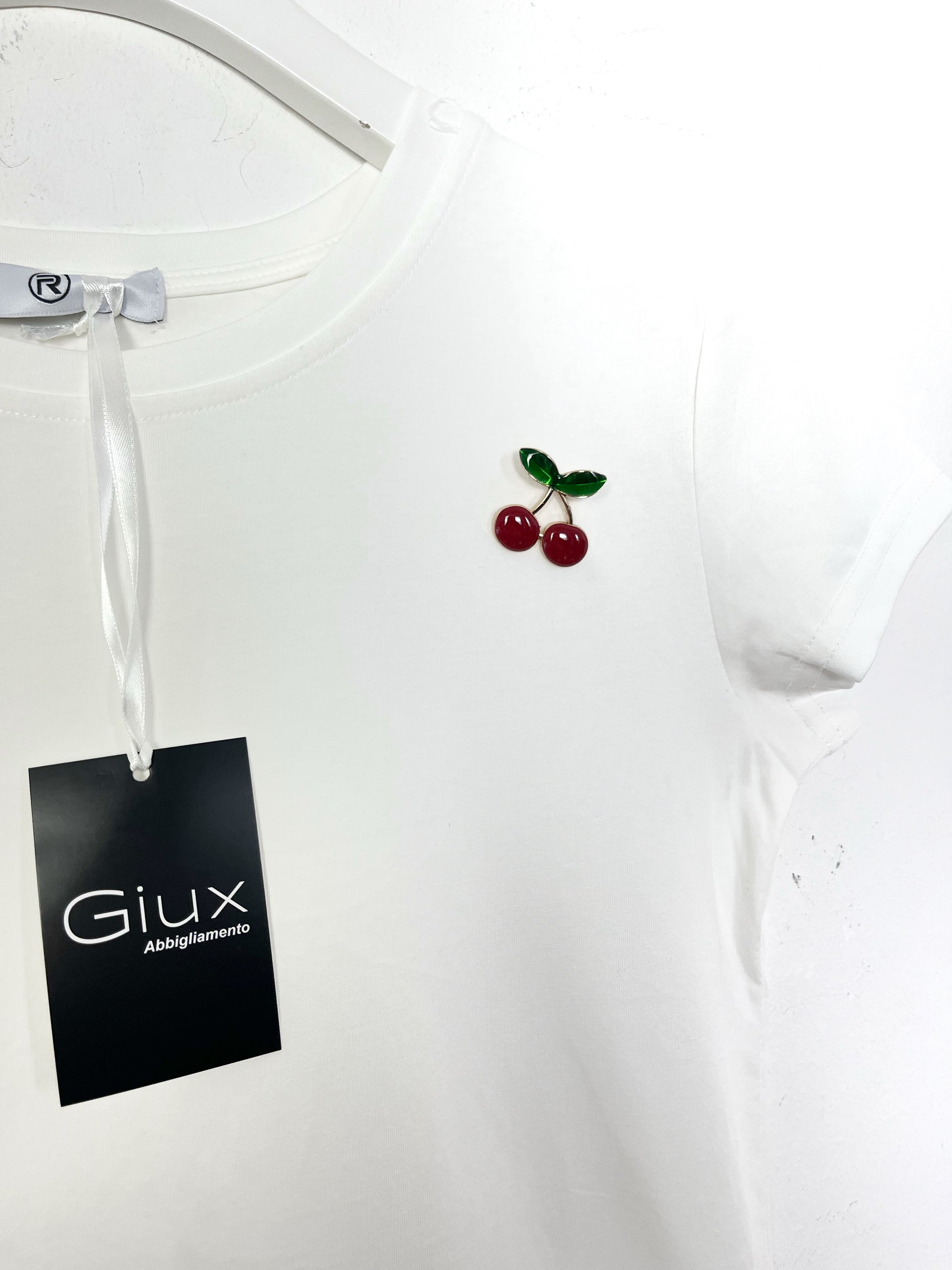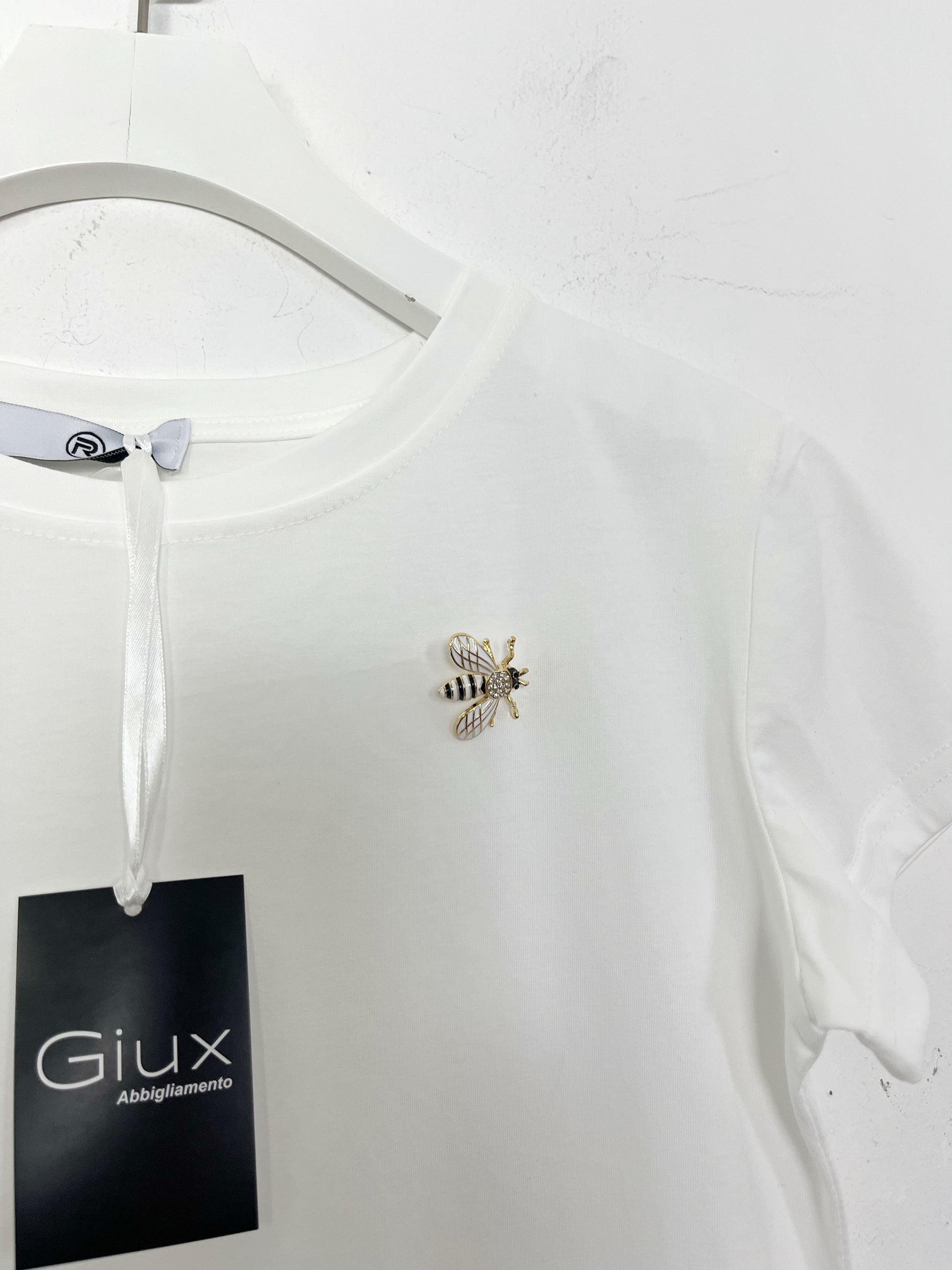 T-shirt in cotone elasticizzato. Linea aderente, mezza manica. Con spilla