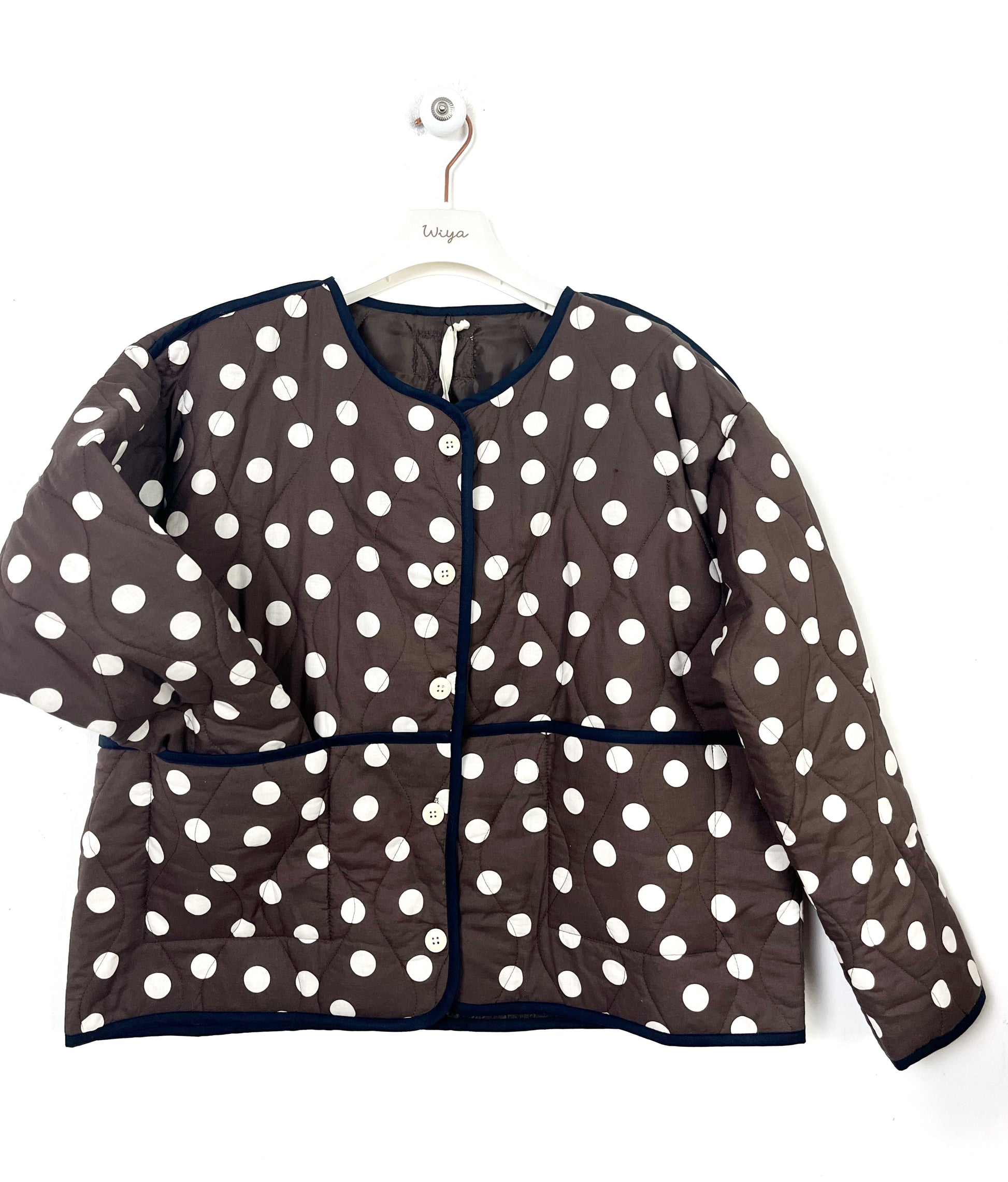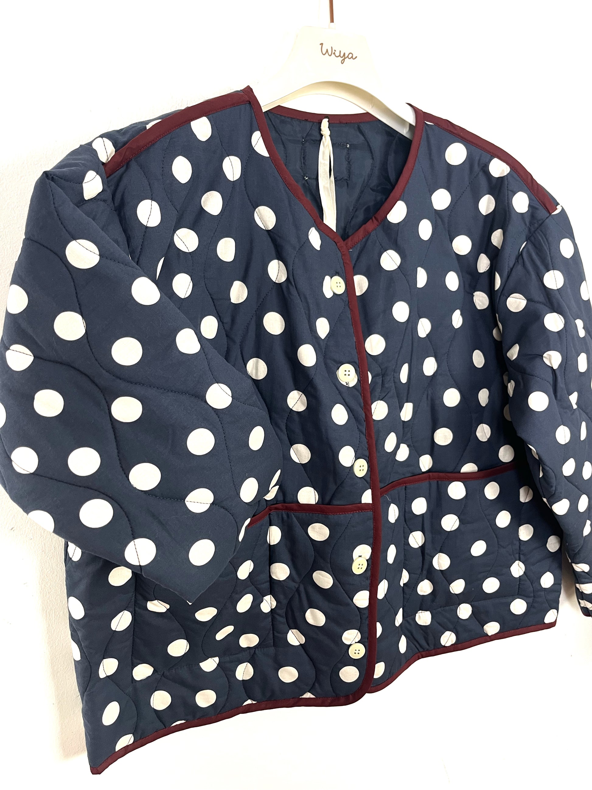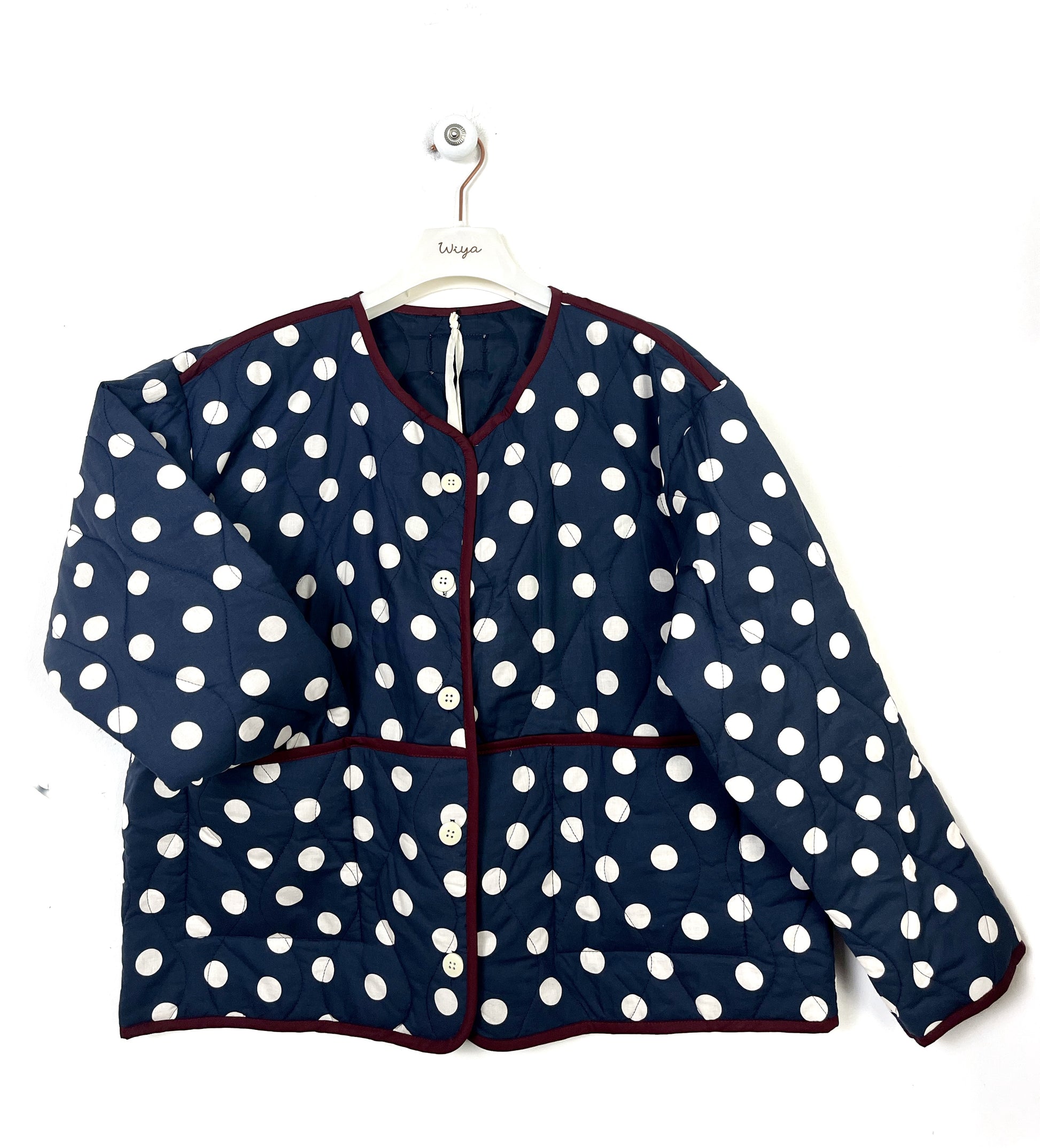 Trapuntino leggero girocollo. Taglio a scatoletta. Manica lunga, chiusura con asole e bottoni. Tasche sul davanti, profili in contrasto