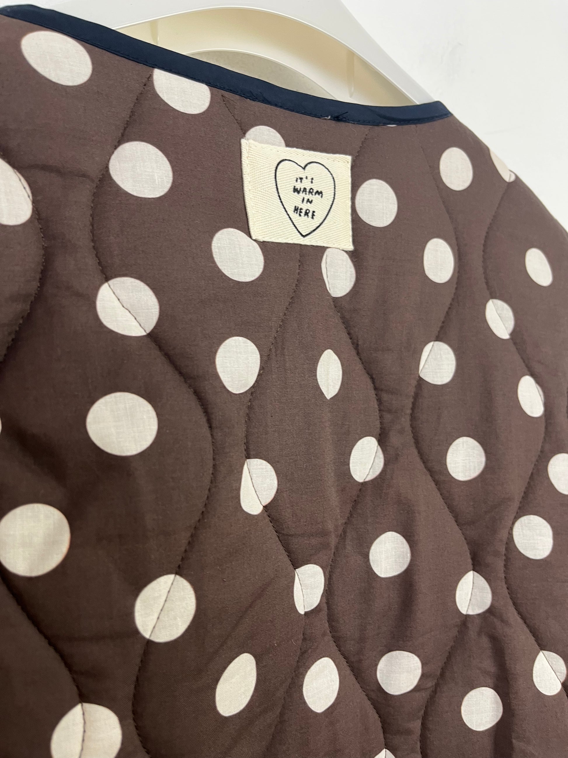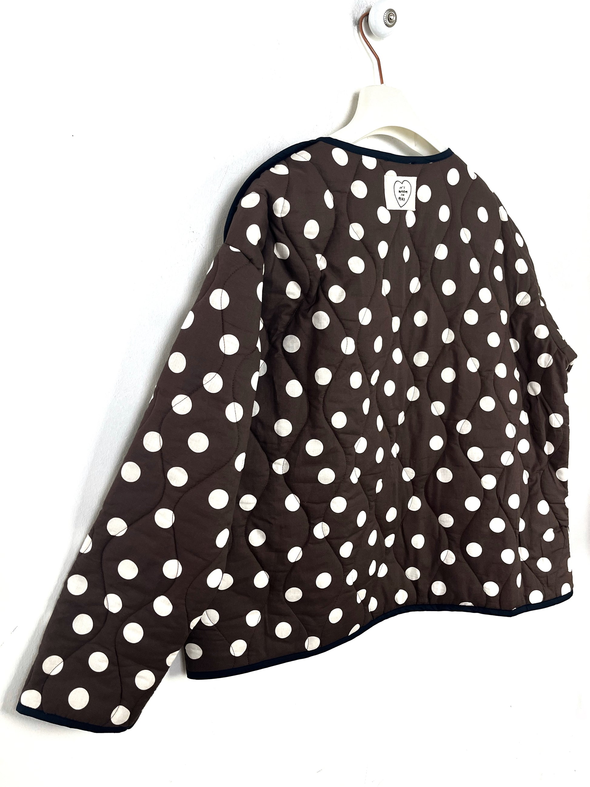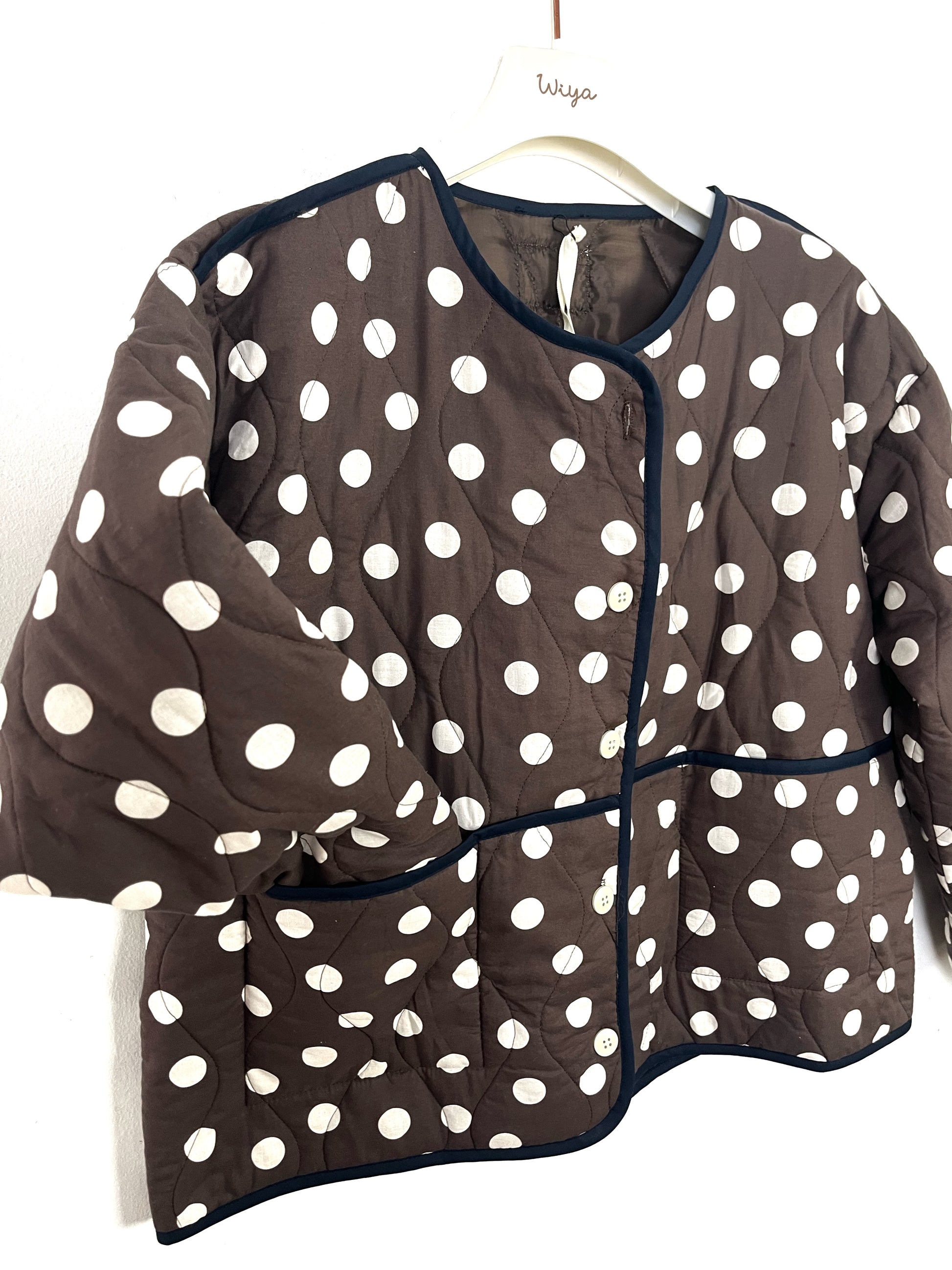 Trapuntino leggero girocollo. Taglio a scatoletta. Manica lunga, chiusura con asole e bottoni. Tasche sul davanti, profili in contrasto