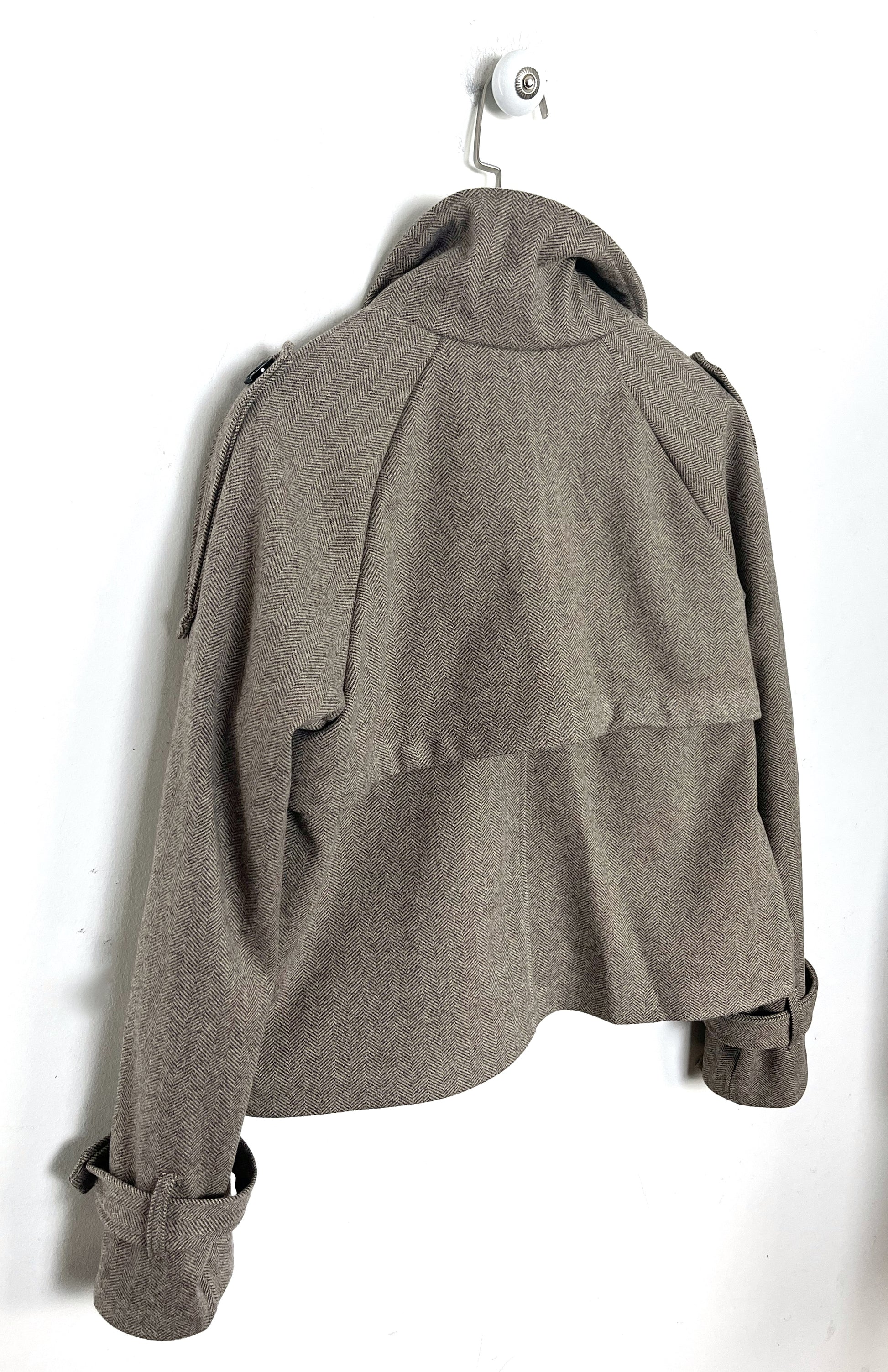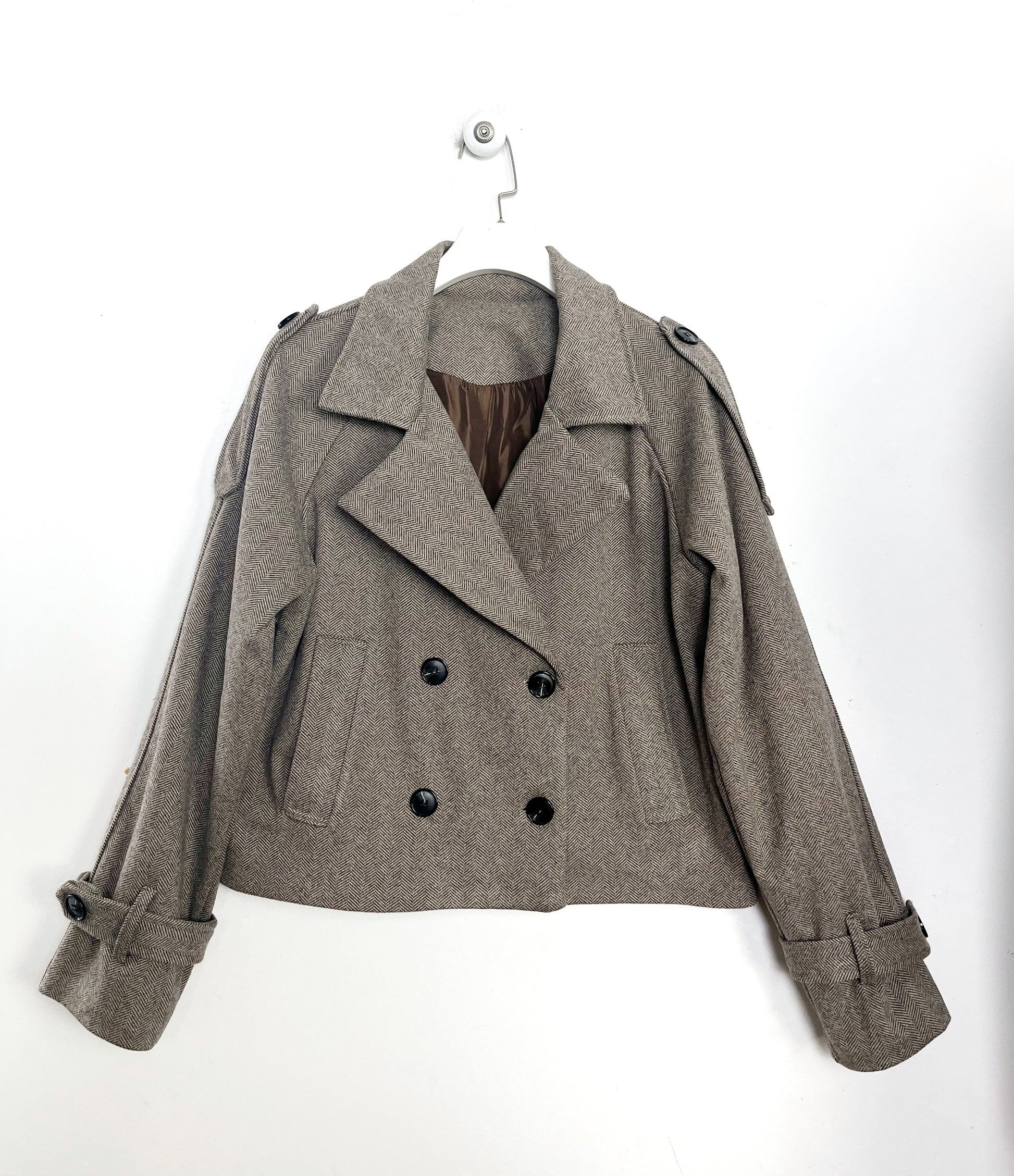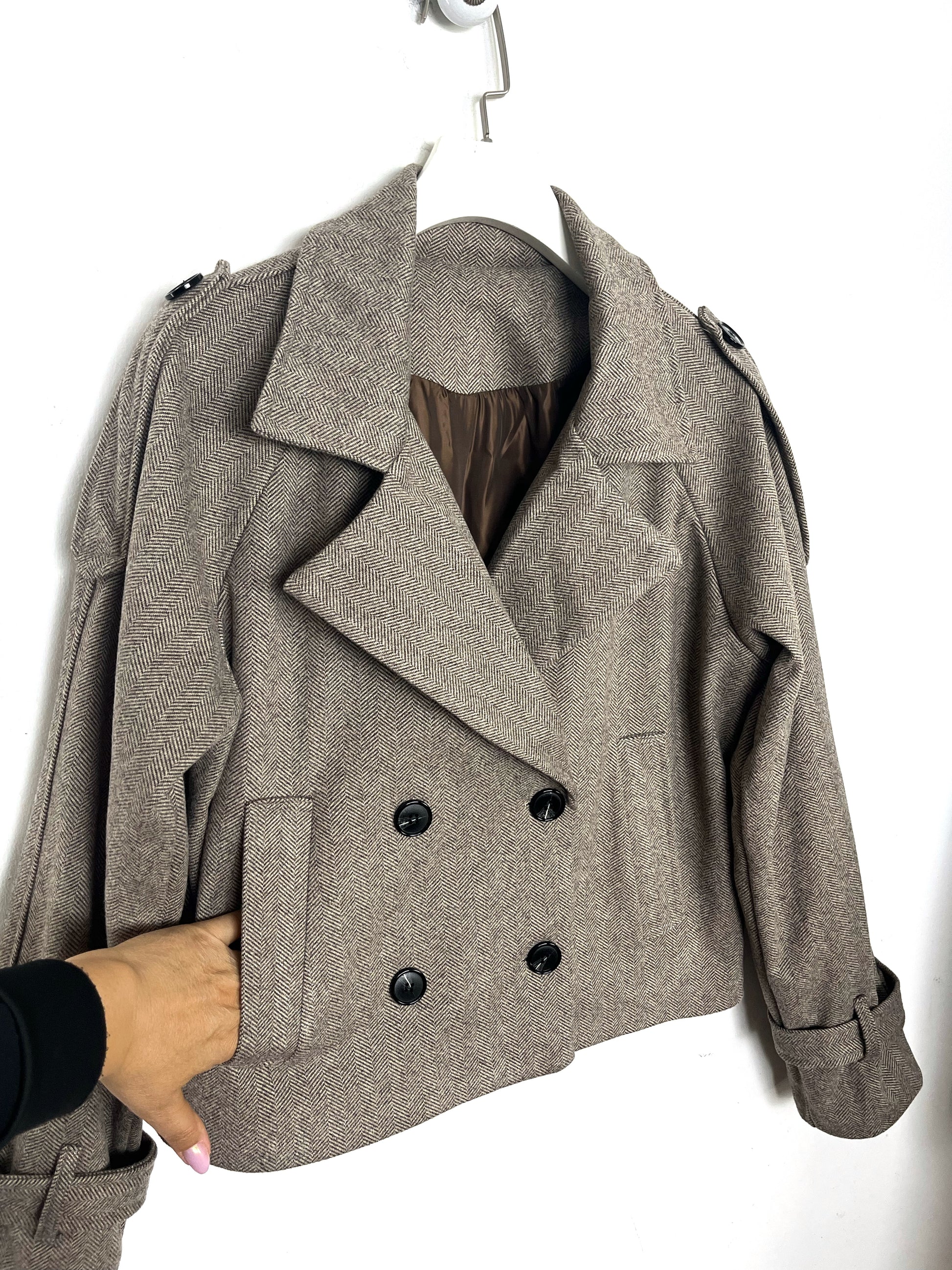 Trench corto in tessuto, fantasia spigata. Manica Lunga, con cinghino e passanti. Colletto con revers. Abbottonata sul davanti, Doppio petto. spalla ribassata. Foderato