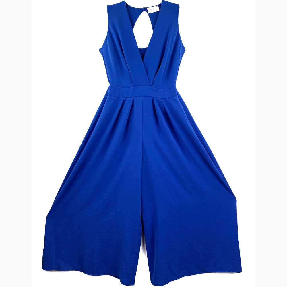 Tuta intera. Smanicata, scollo incrociato. Elastico in vita. arricciata dietro. Gamba larga, lunghezza alla caviglia.