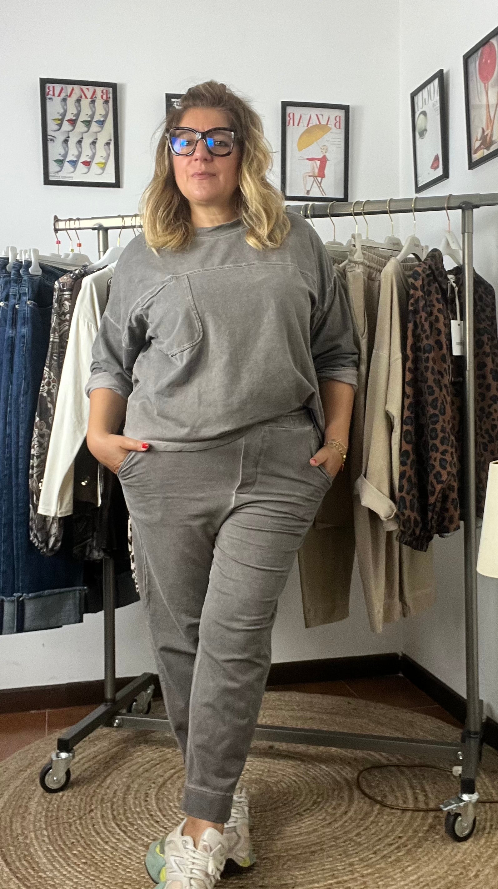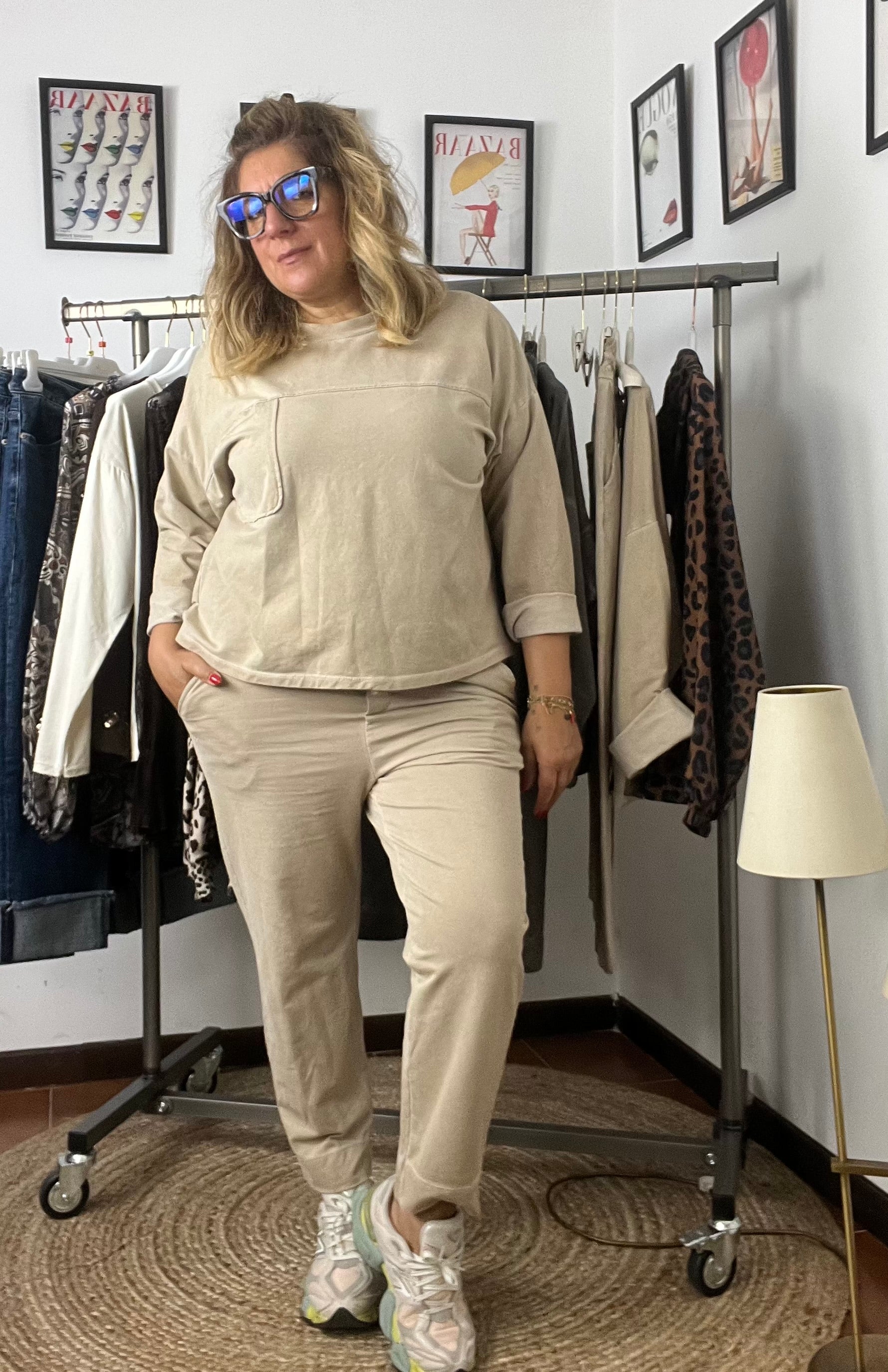 Tuta completa in cotone garzato. Felpa girocollo con spalla ribassata e taschina applicata sul davanti. Pantalone vita alta con elastico e coulissi. Tasche laterali. Tasche applicate dietro